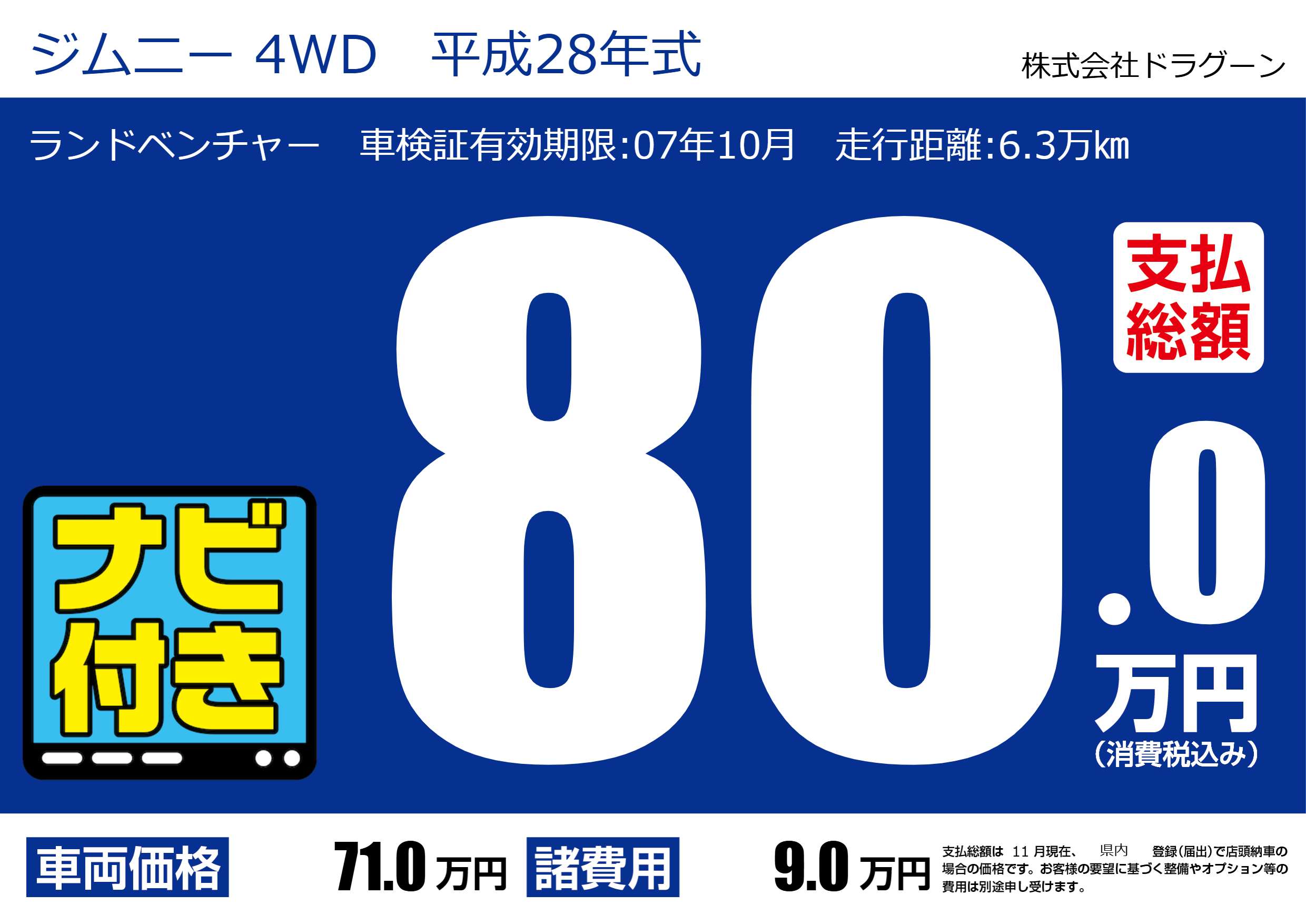 | 車名 | ジムニー 4WD 平成28年式 | グレード ミッション 排気量 |