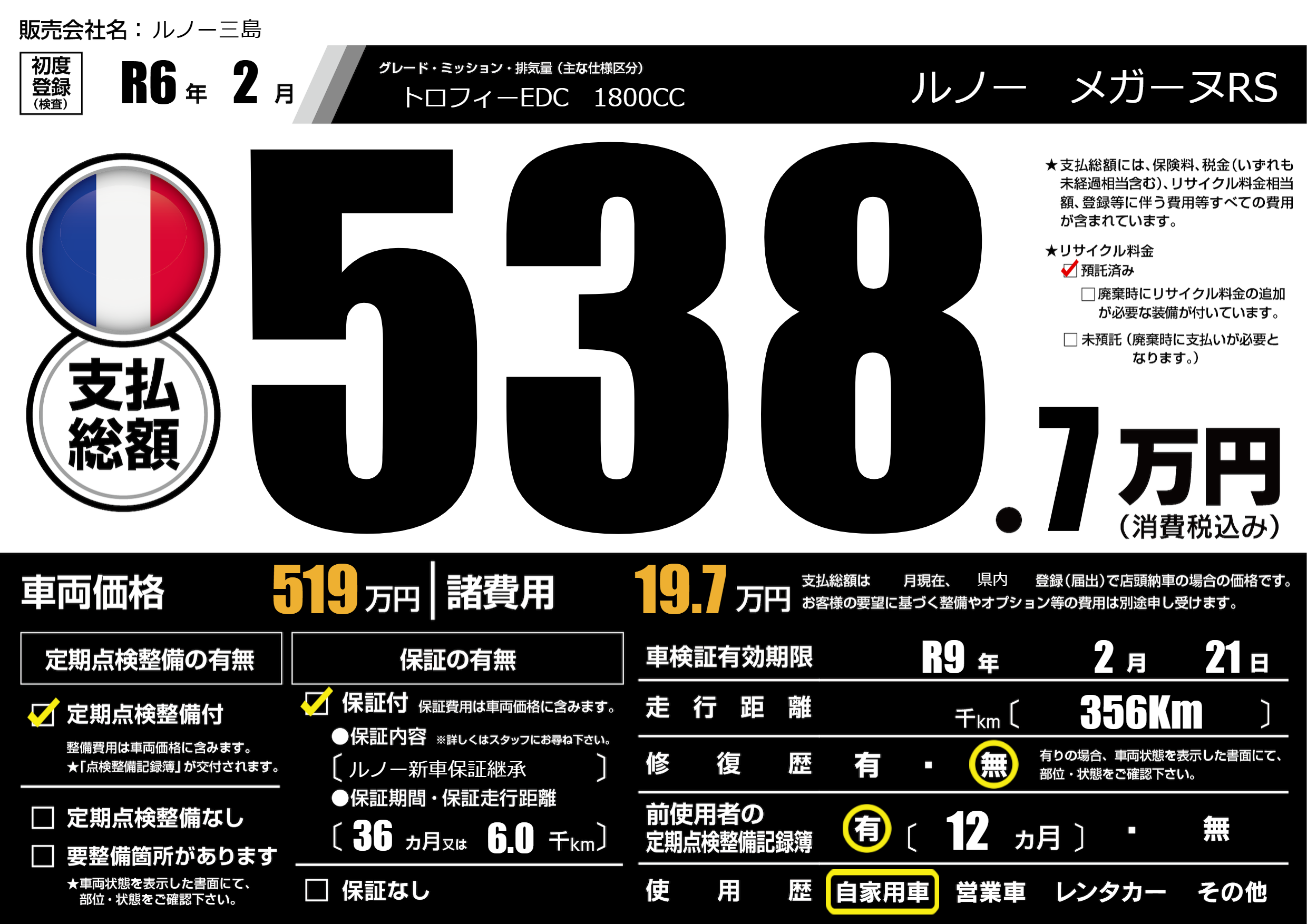 保証なし 保証内容(ルノー新車保証継承) 36ヶ月または(6.0)千kmまで |