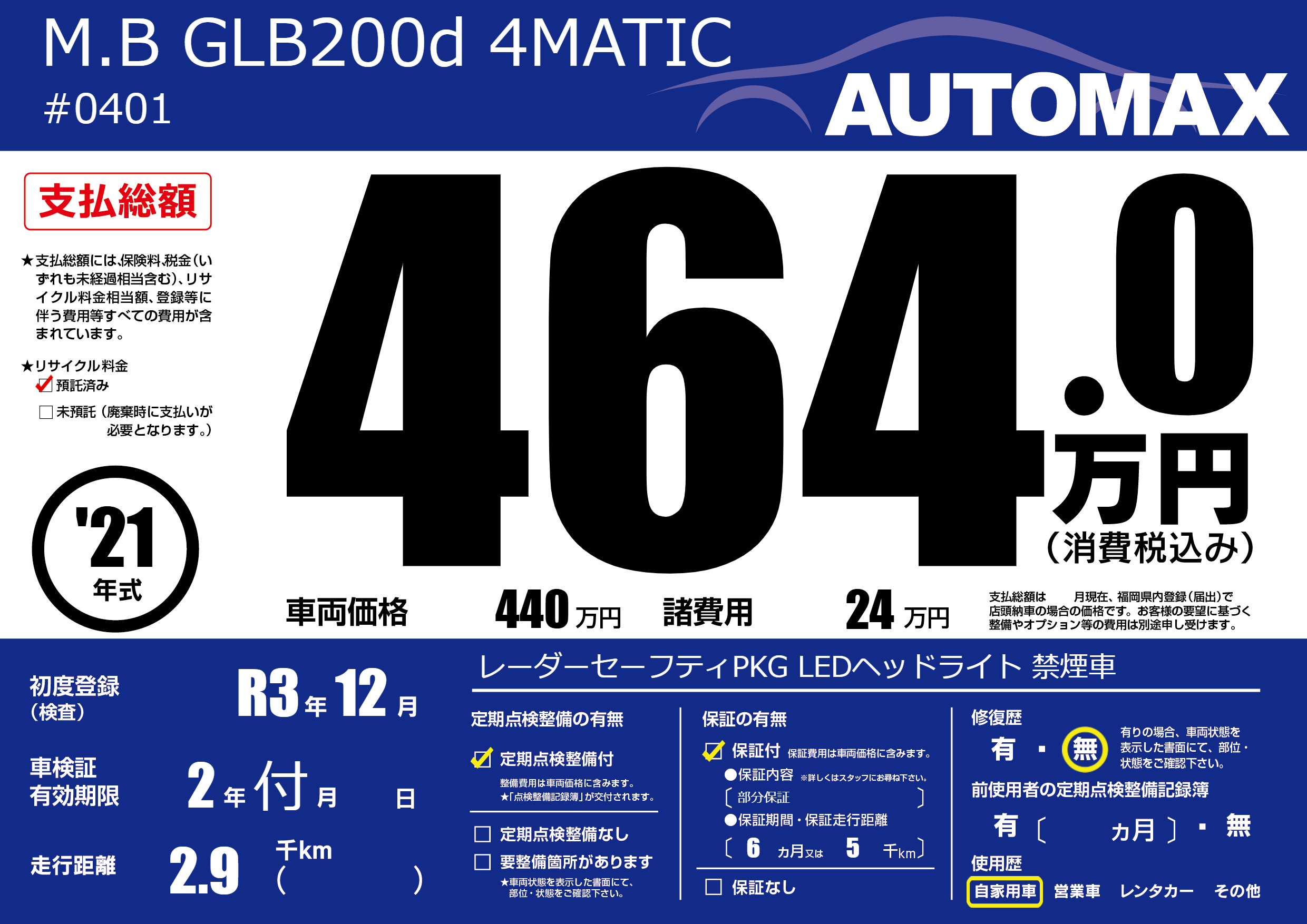 | 車名 | M.B GLB200d 4MATIC | グレード ミッション 排気量 |