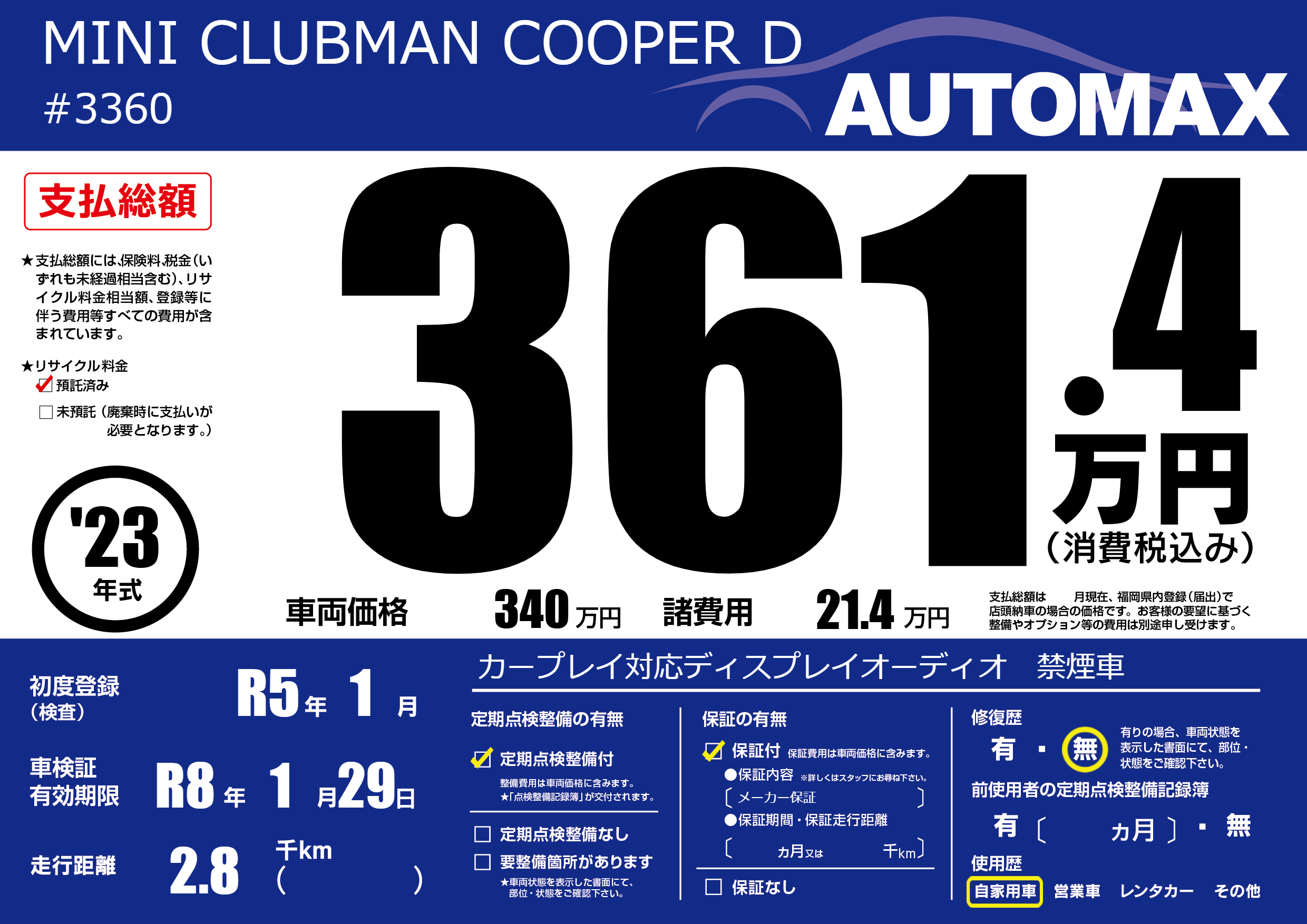 | 車名 | MINI CLUBMAN COOPER D | グレード ミッション 排気量 |