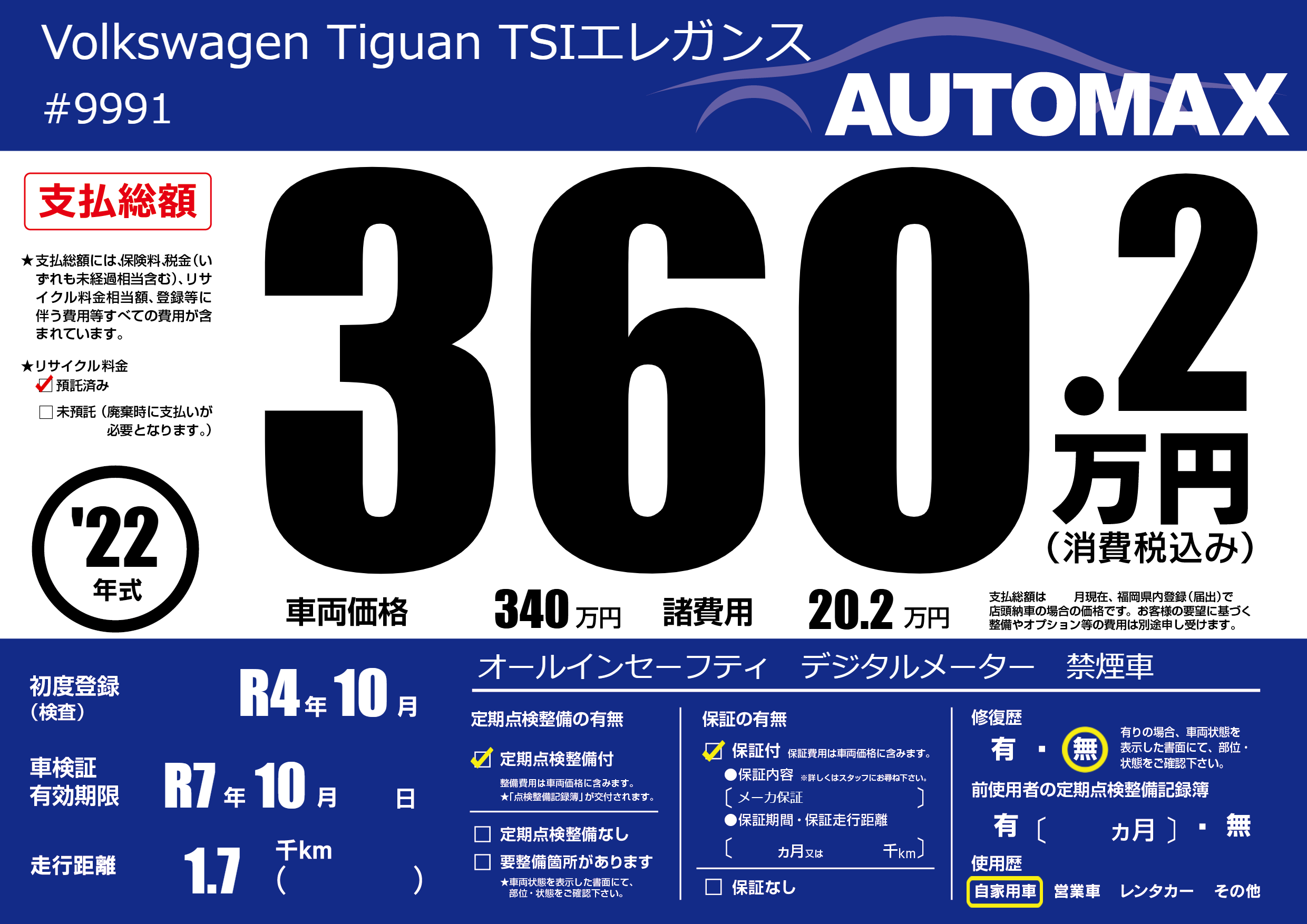| 車名 | Volkswagen Tiguan TSIエレガンス | グレード ミッション 排気量 |