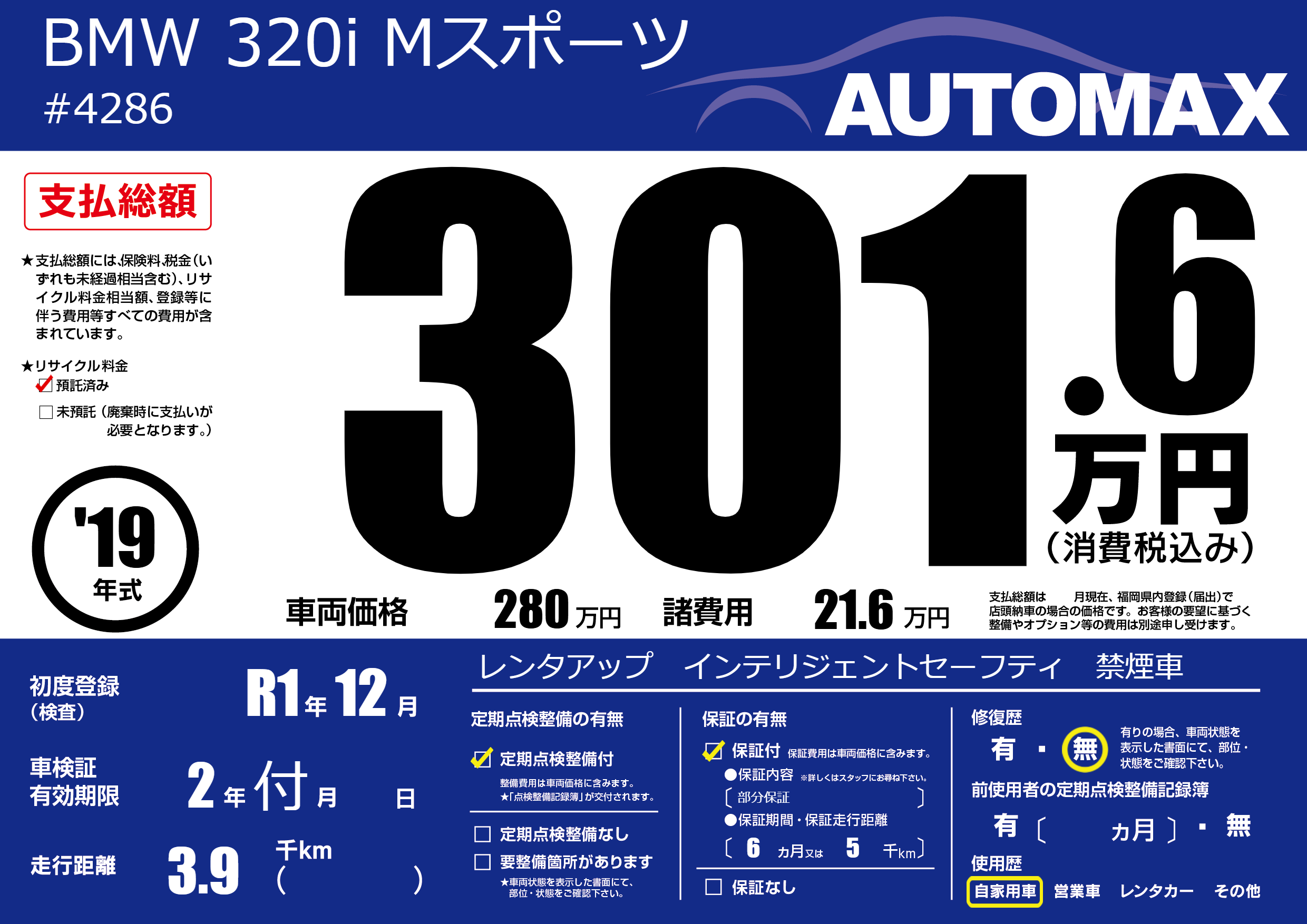 | 車名 | BMW 320i Mスポーツ | グレード ミッション 排気量 |