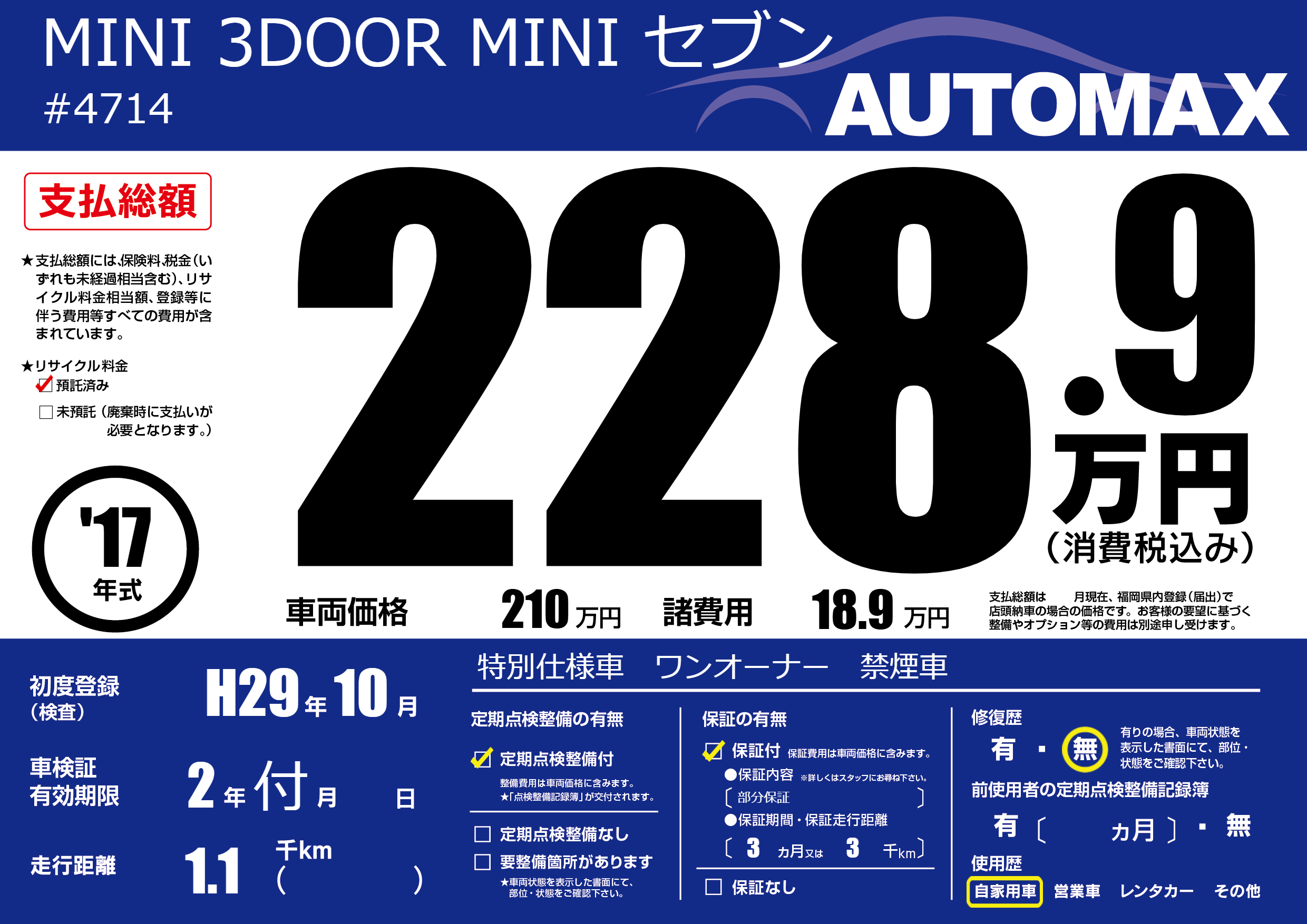 | 車名 | MINI 3DOOR MINI セブン | グレード ミッション 排気量 |