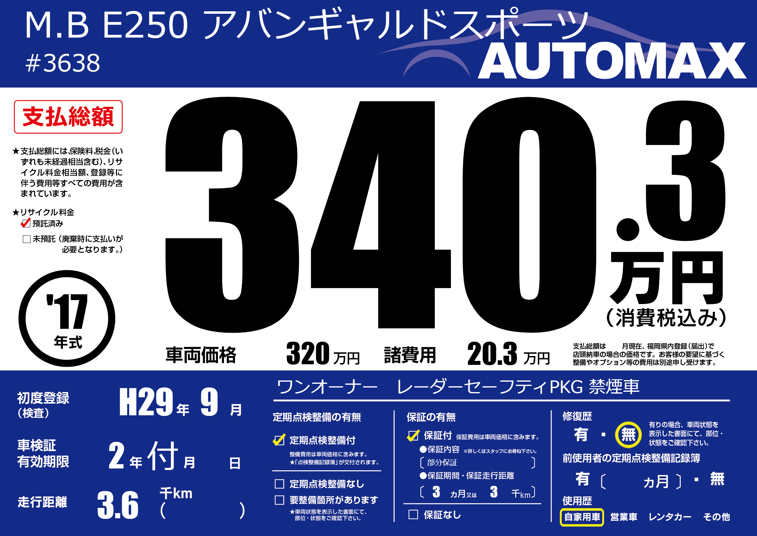 | 車名 | M.B E250 アバンギャルドスポーツ | グレード ミッション 排気量 |