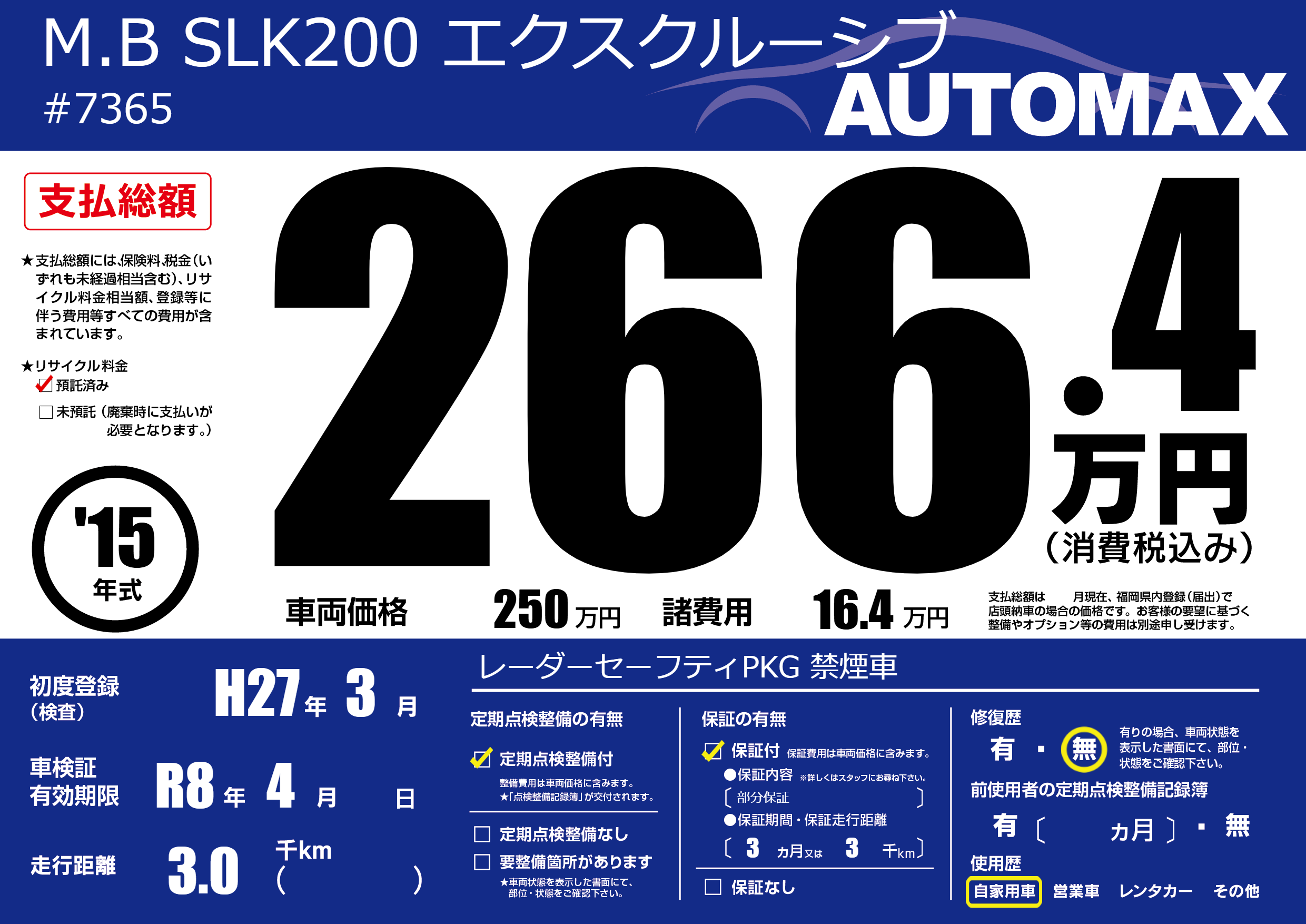 | 車名 | M.B SLK200 エクスクルーシブ | グレード ミッション 排気量 |