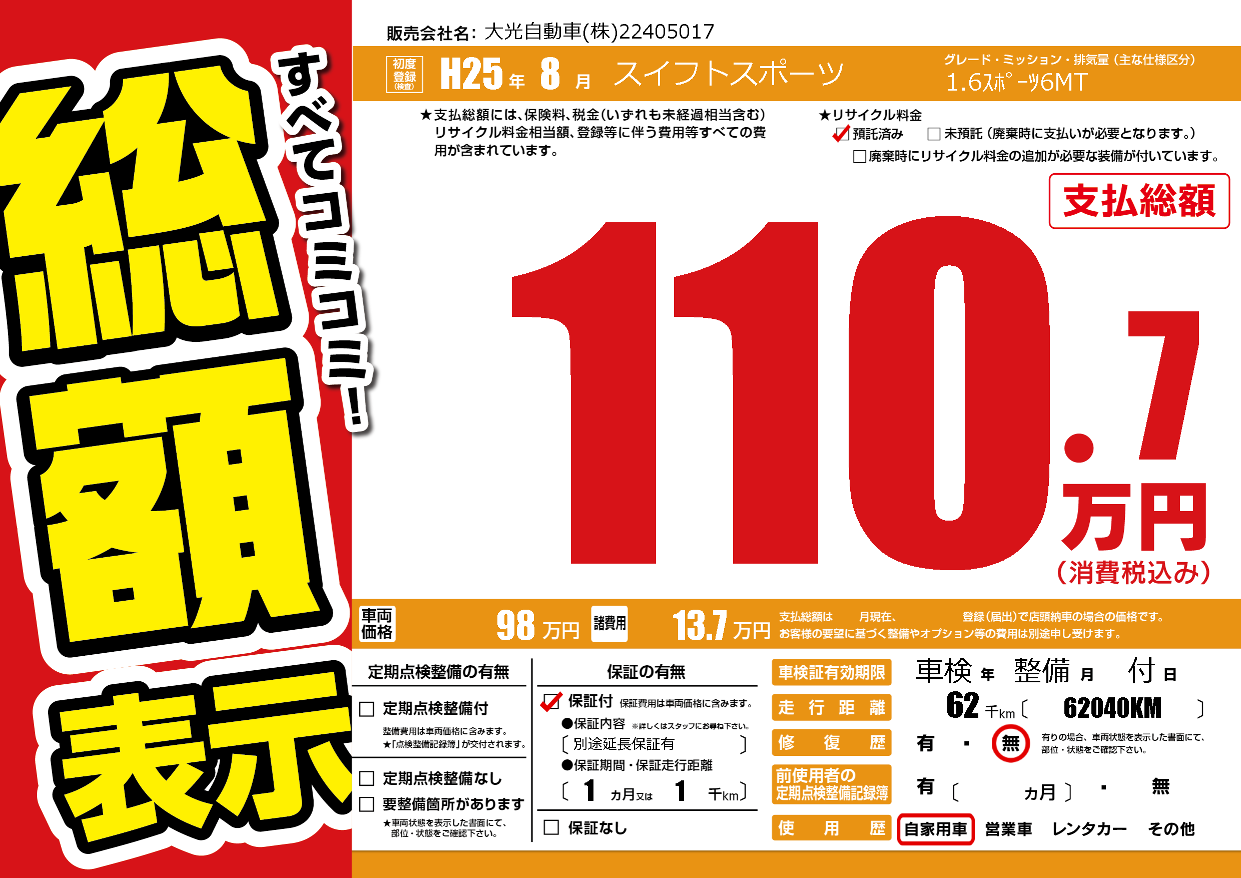 | 車名 | スイフトスポーツ | グレード ミッション 排気量 |