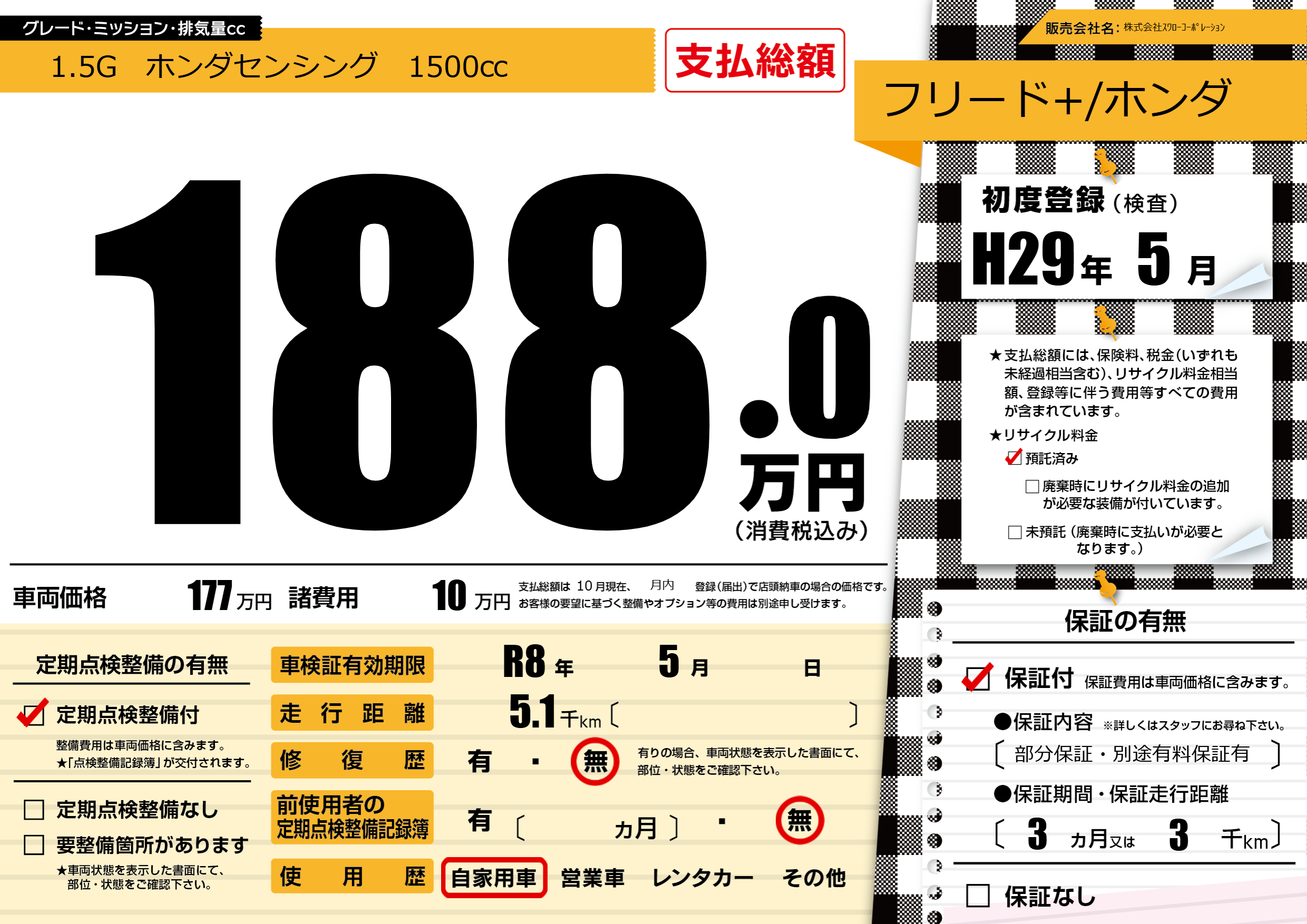 | 車名 | フリード+/ホンダ | グレード ミッション 排気量 |