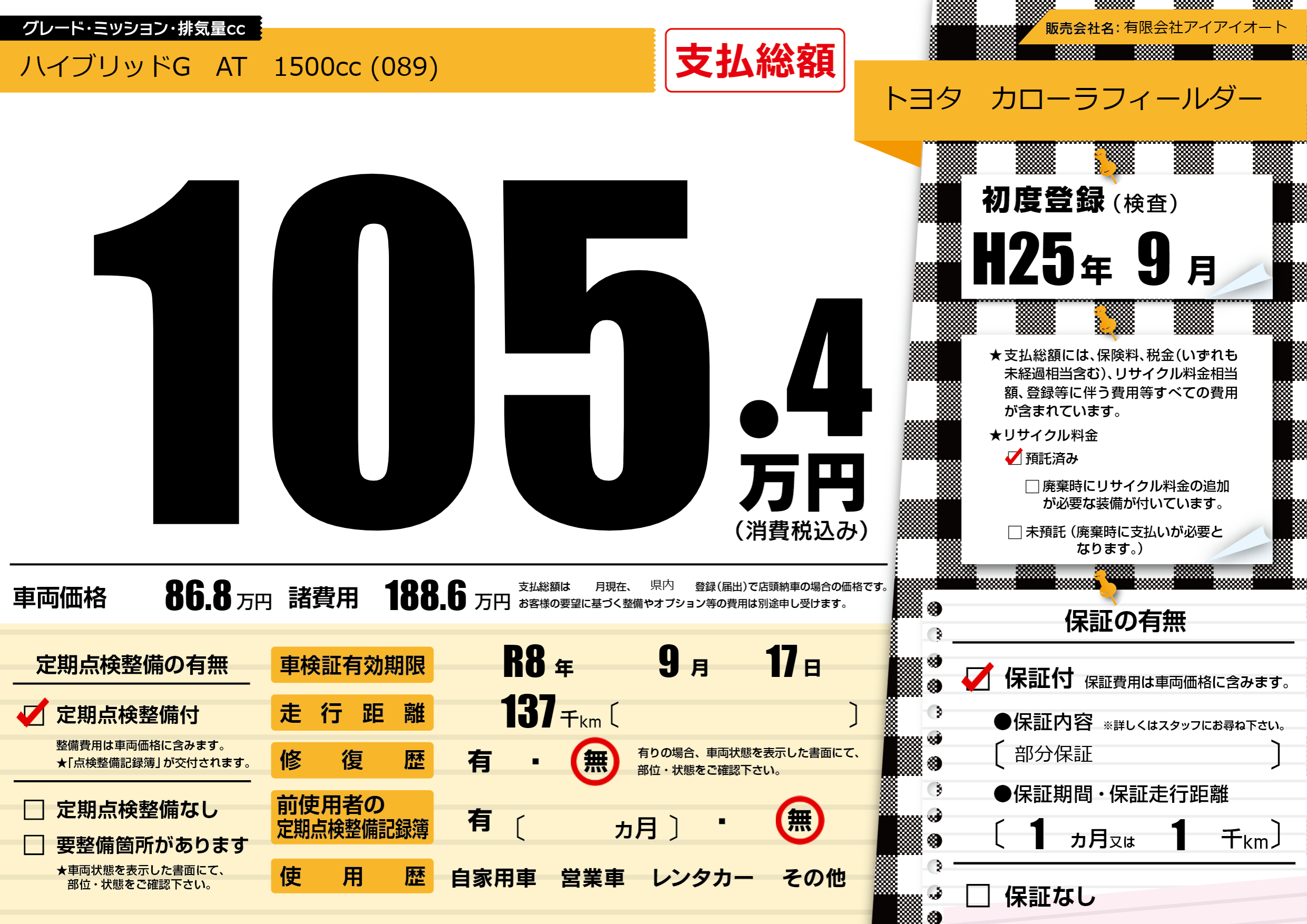 | 車名 | トヨタ カローラフィールダー | グレード ミッション 排気量 |