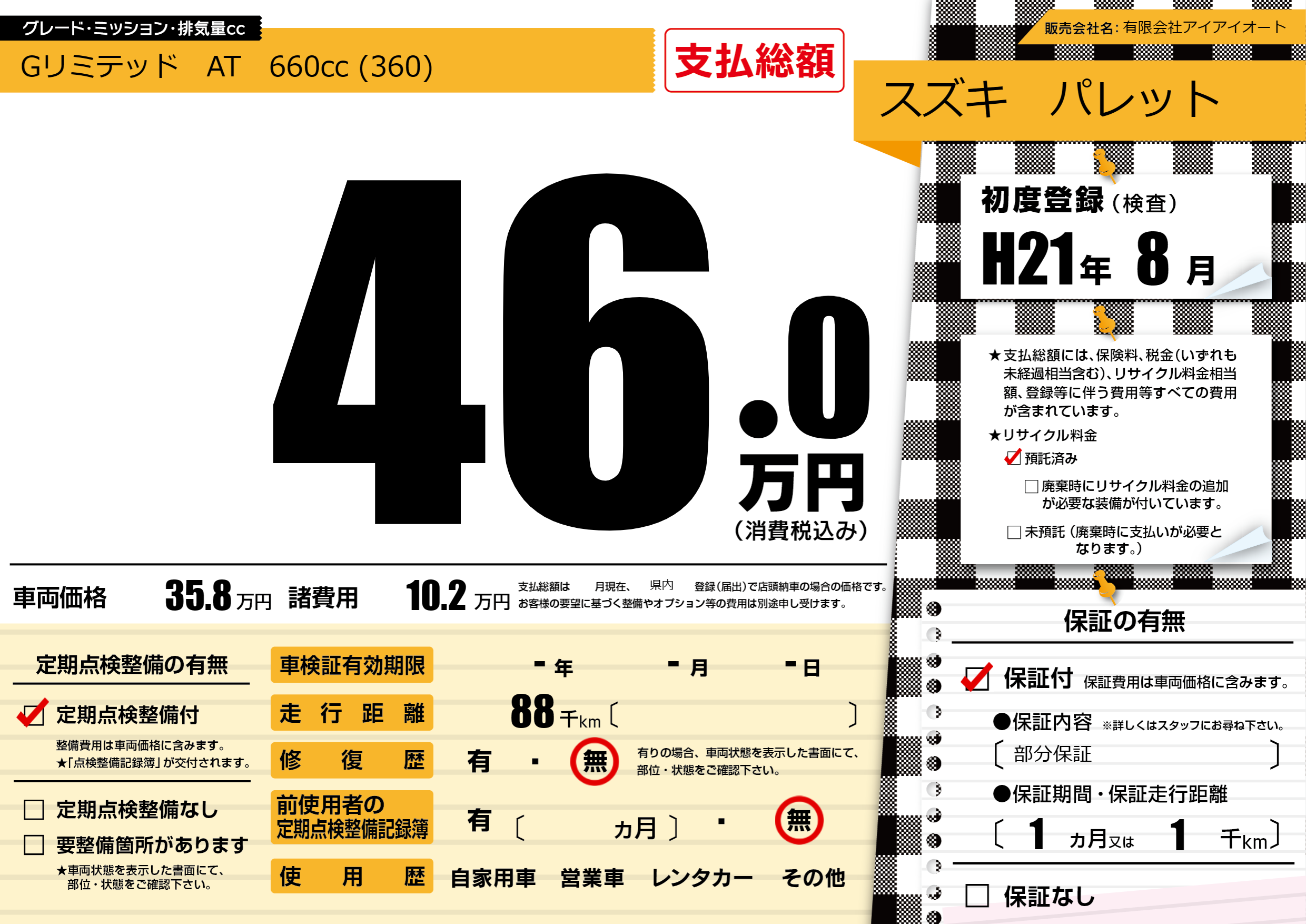 | 車名 | スズキ パレット | グレード ミッション 排気量 |