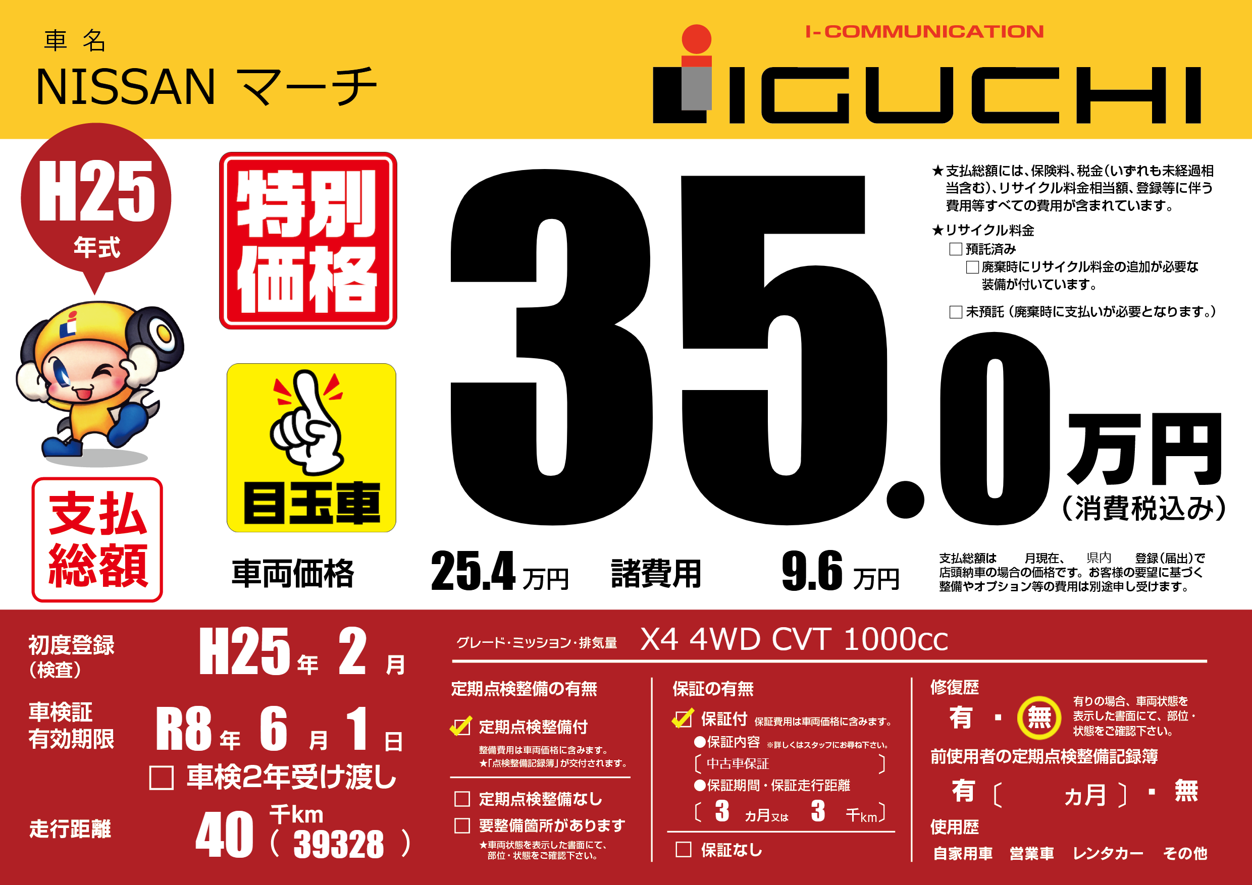 | 車名 | NISSAN マーチ | グレード ミッション 排気量 |