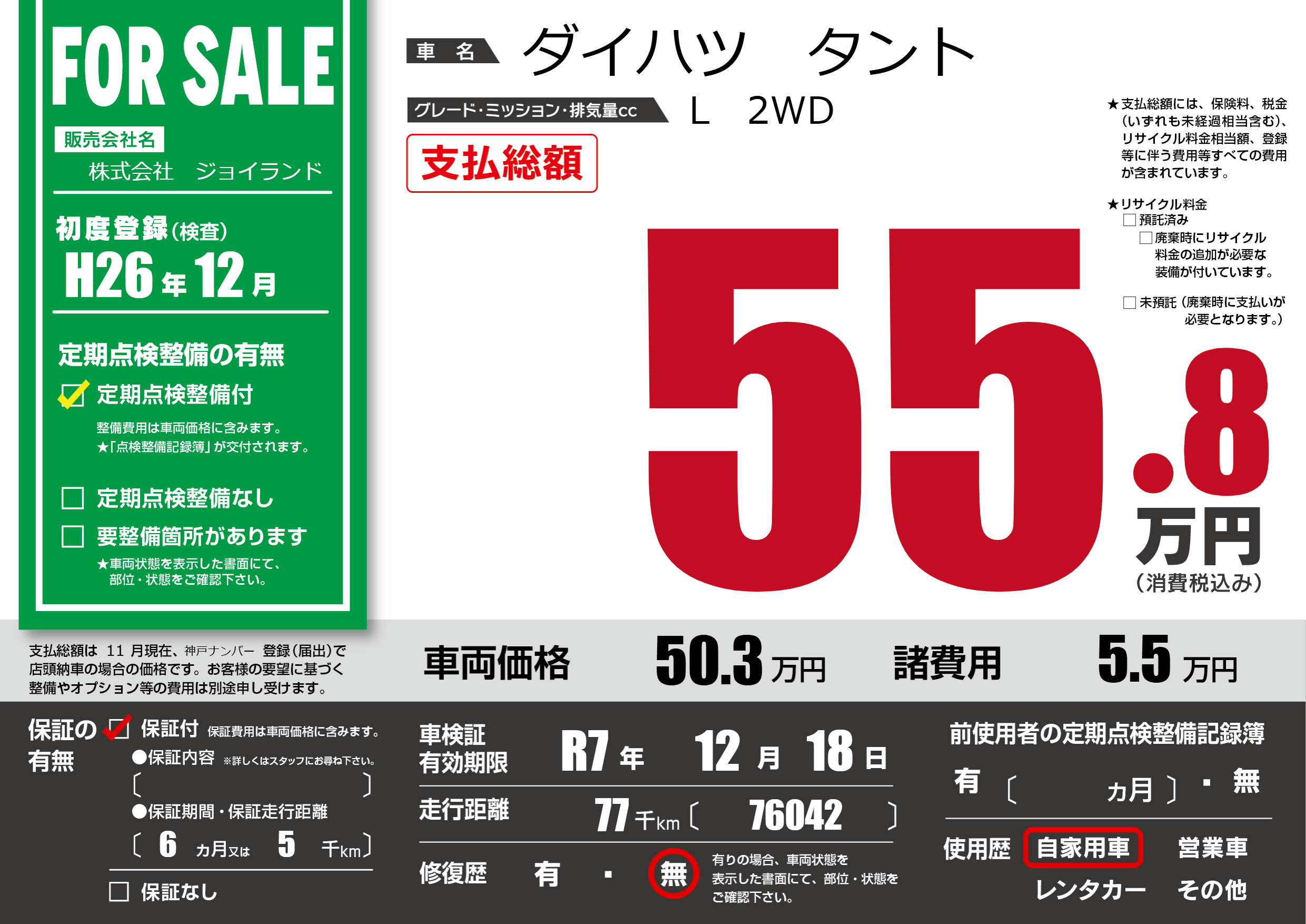 | 走行キロ | 7.7万km | 初年度登録 | H26年12月 |