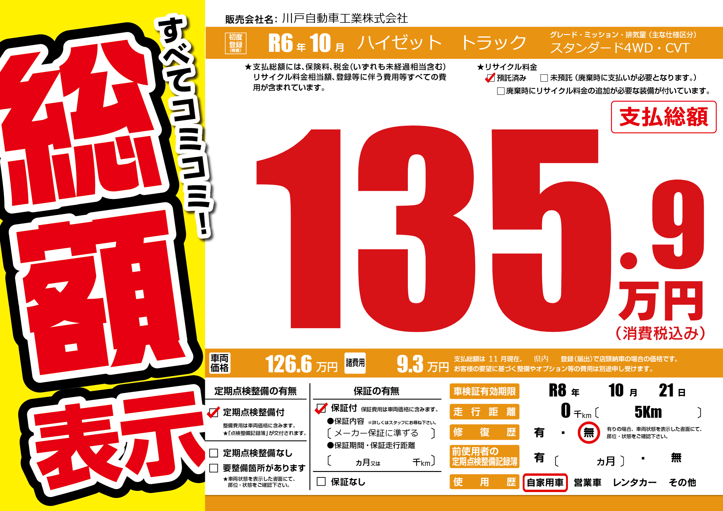 保証付き 保証内容(メーカー保証に準ずる) ヶ月または千km |