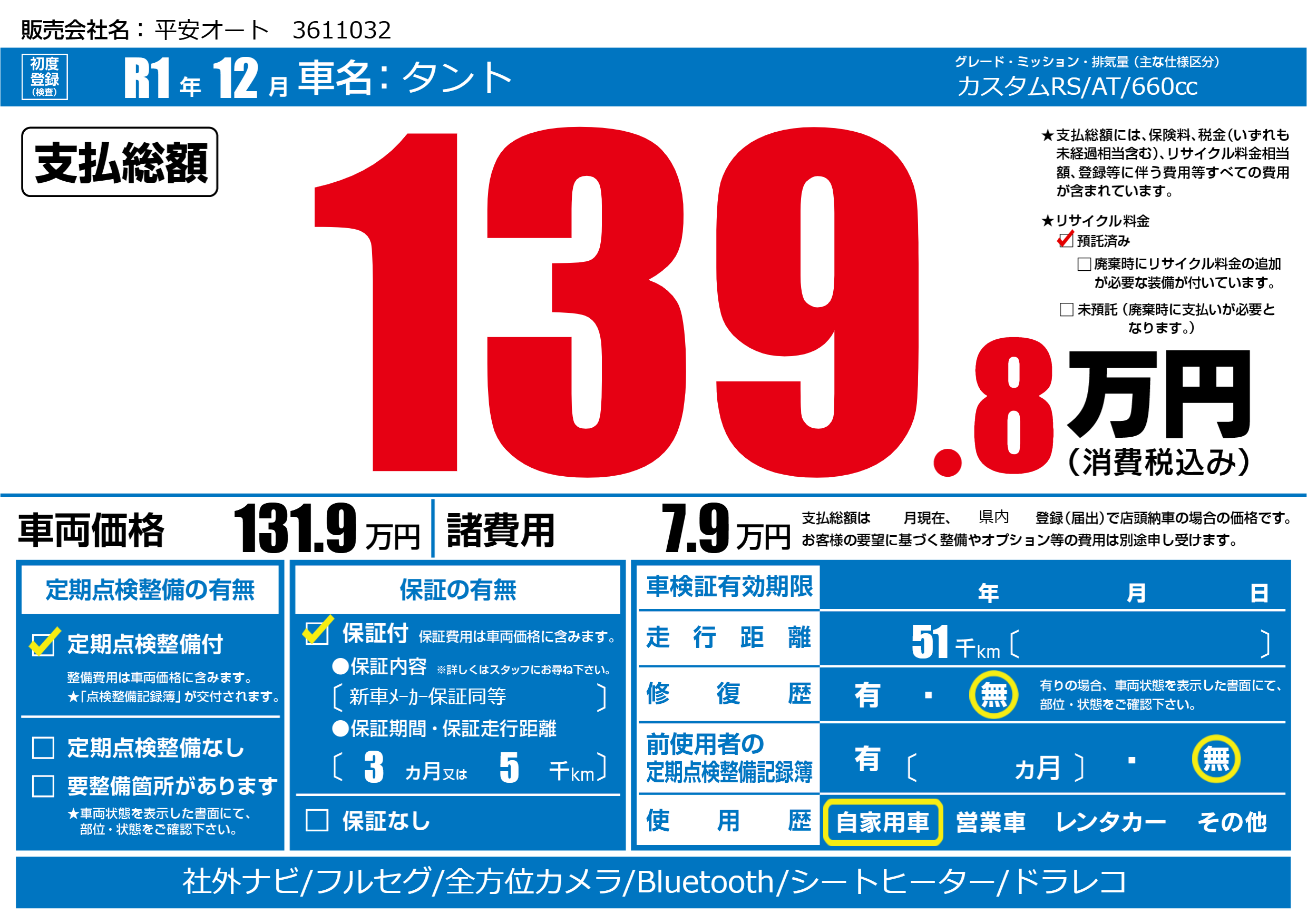 | 走行キロ | 5.1万km | 初年度登録 | R1年12月 |