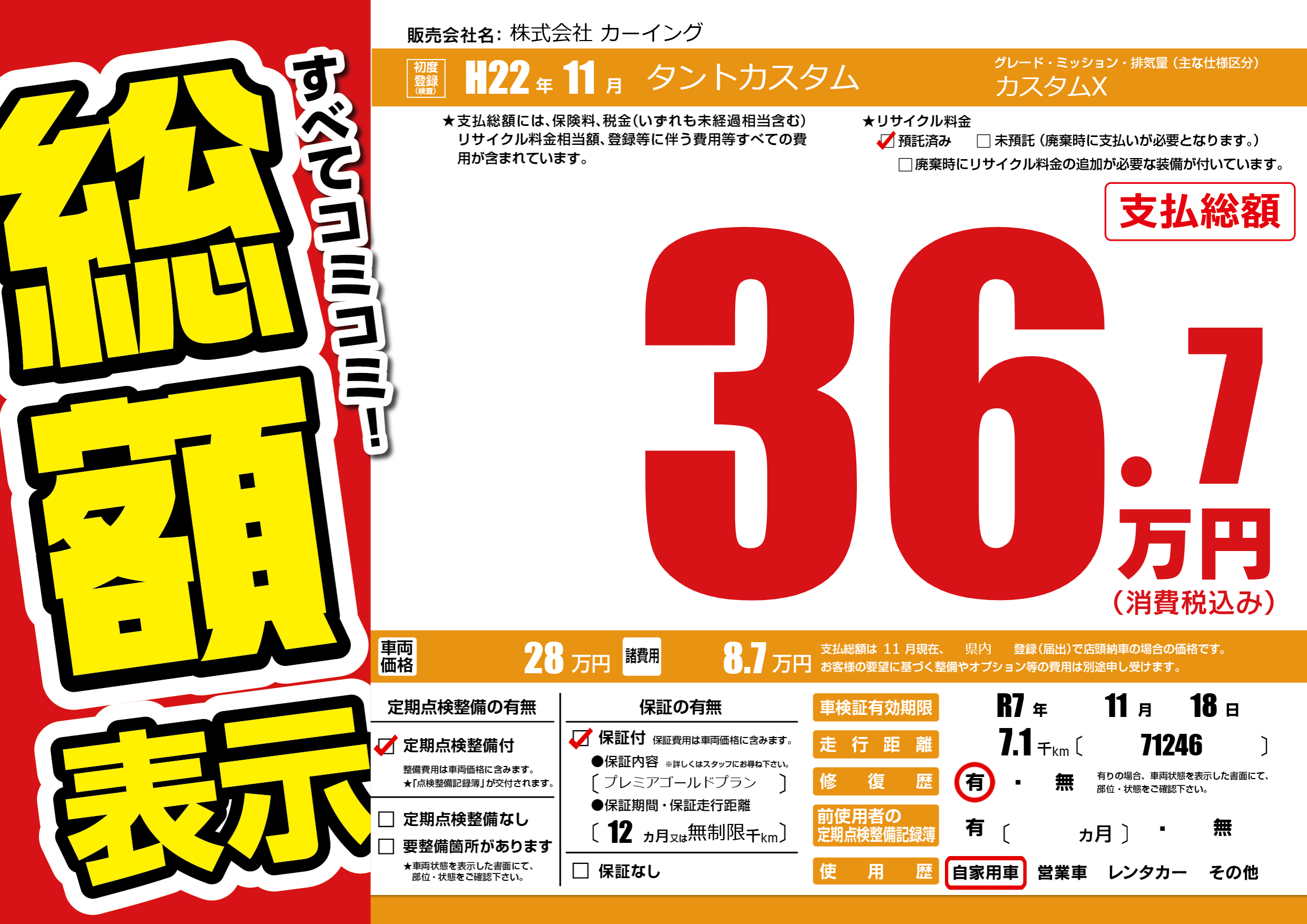 | 車名 | タントカスタム | グレード ミッション 排気量 |