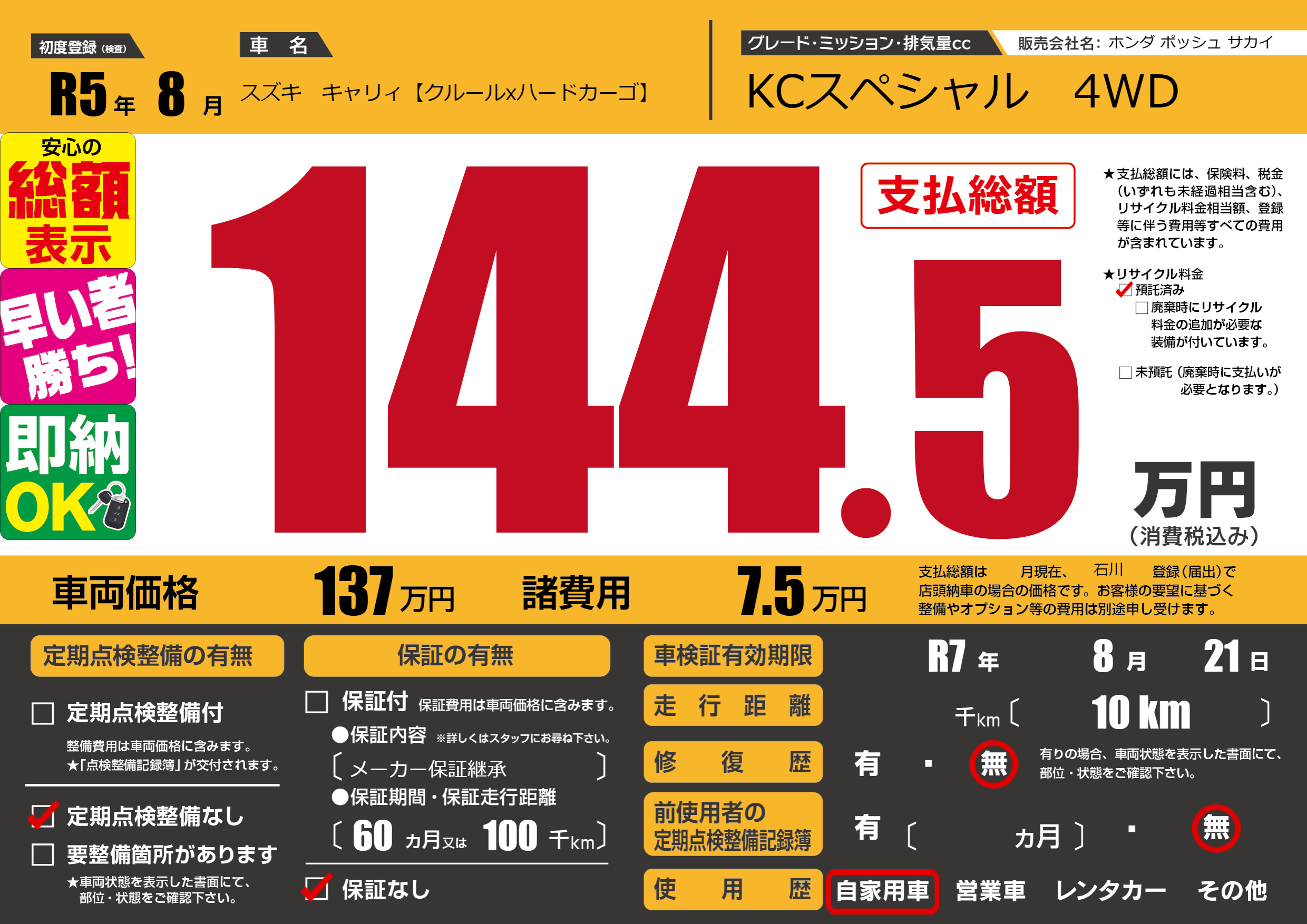| 走行キロ | - | 初年度登録 | R5年8月 |