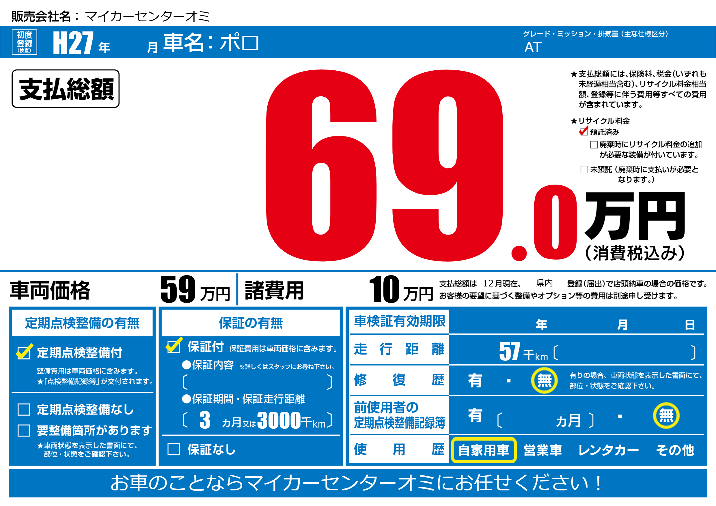 | 車名 | ポロ | グレード ミッション 排気量 |