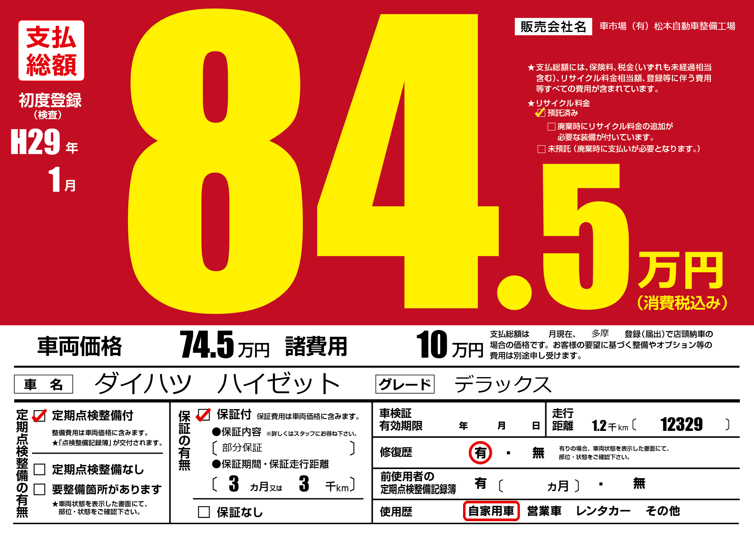 | 車名 | ダイハツ ハイゼット | グレード ミッション 排気量 |