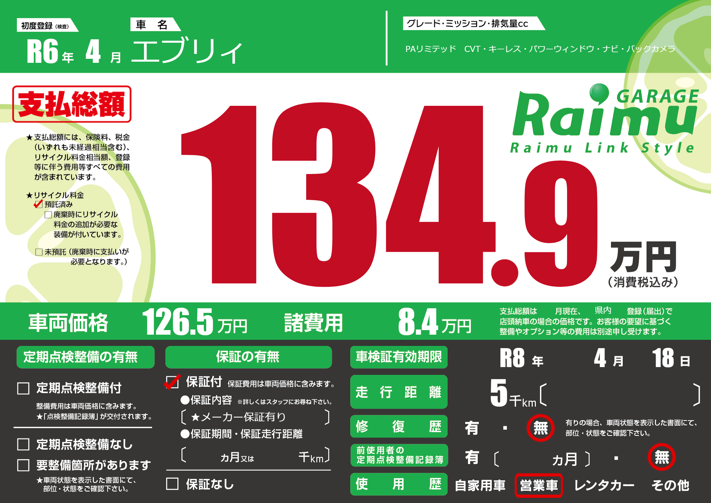 | 車名 | エブリィ | グレード ミッション 排気量 |