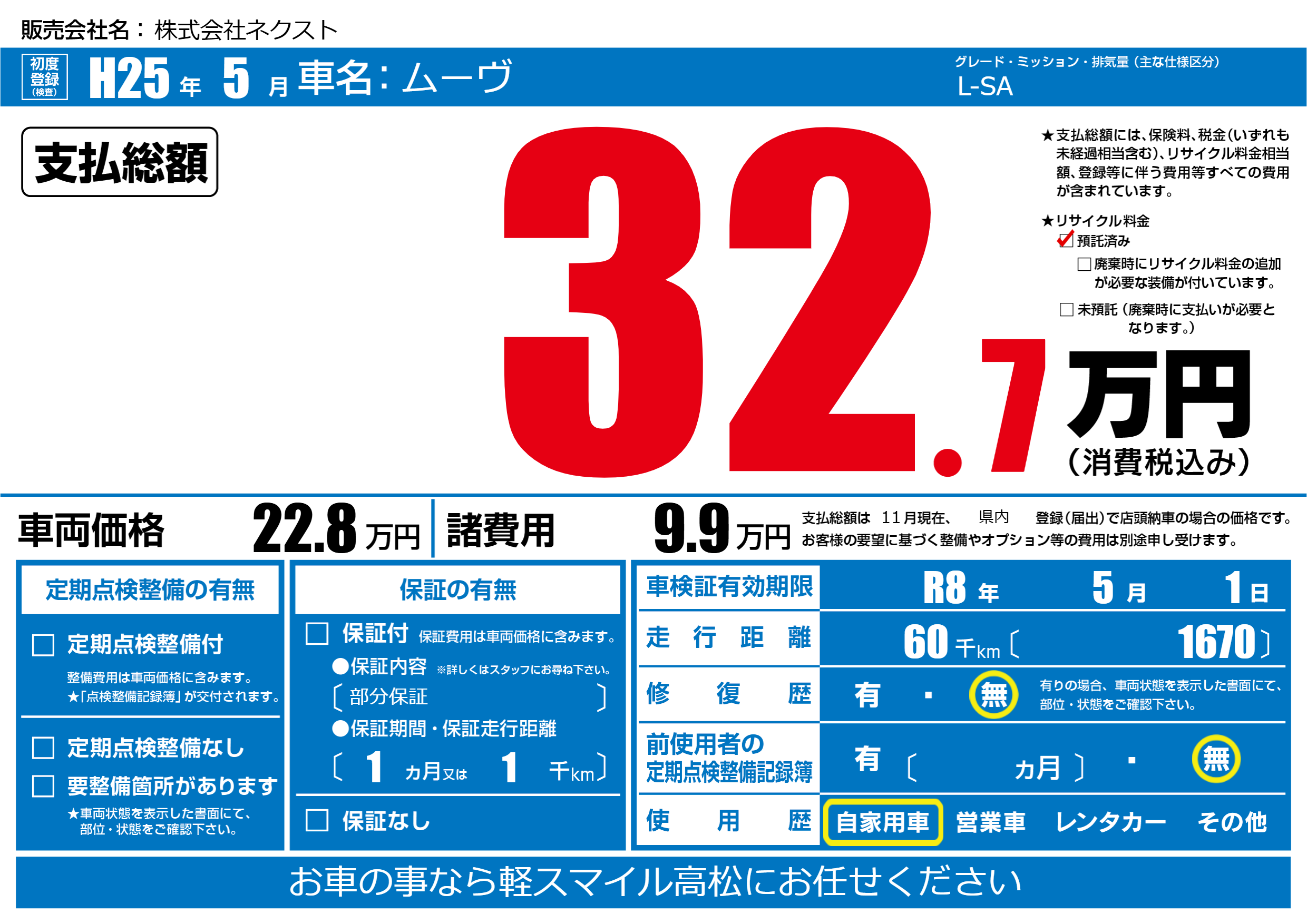 | 車名 | ムーヴ | グレード ミッション 排気量 |