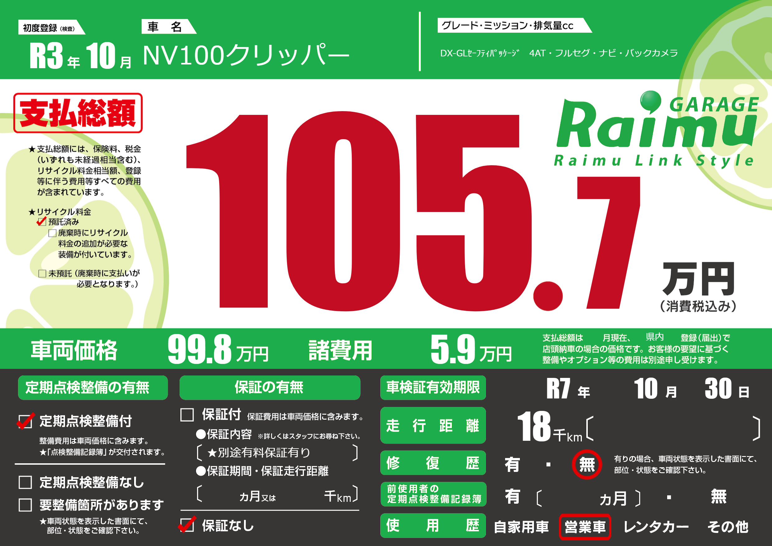 | 車名 | NV100クリッパー | グレード ミッション 排気量 |
