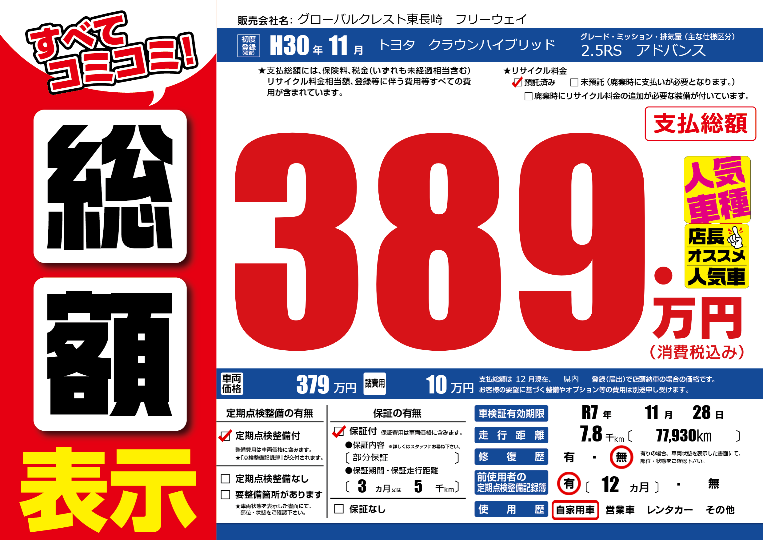| 走行キロ | 0.7万km | 初年度登録 | H30年11月 |