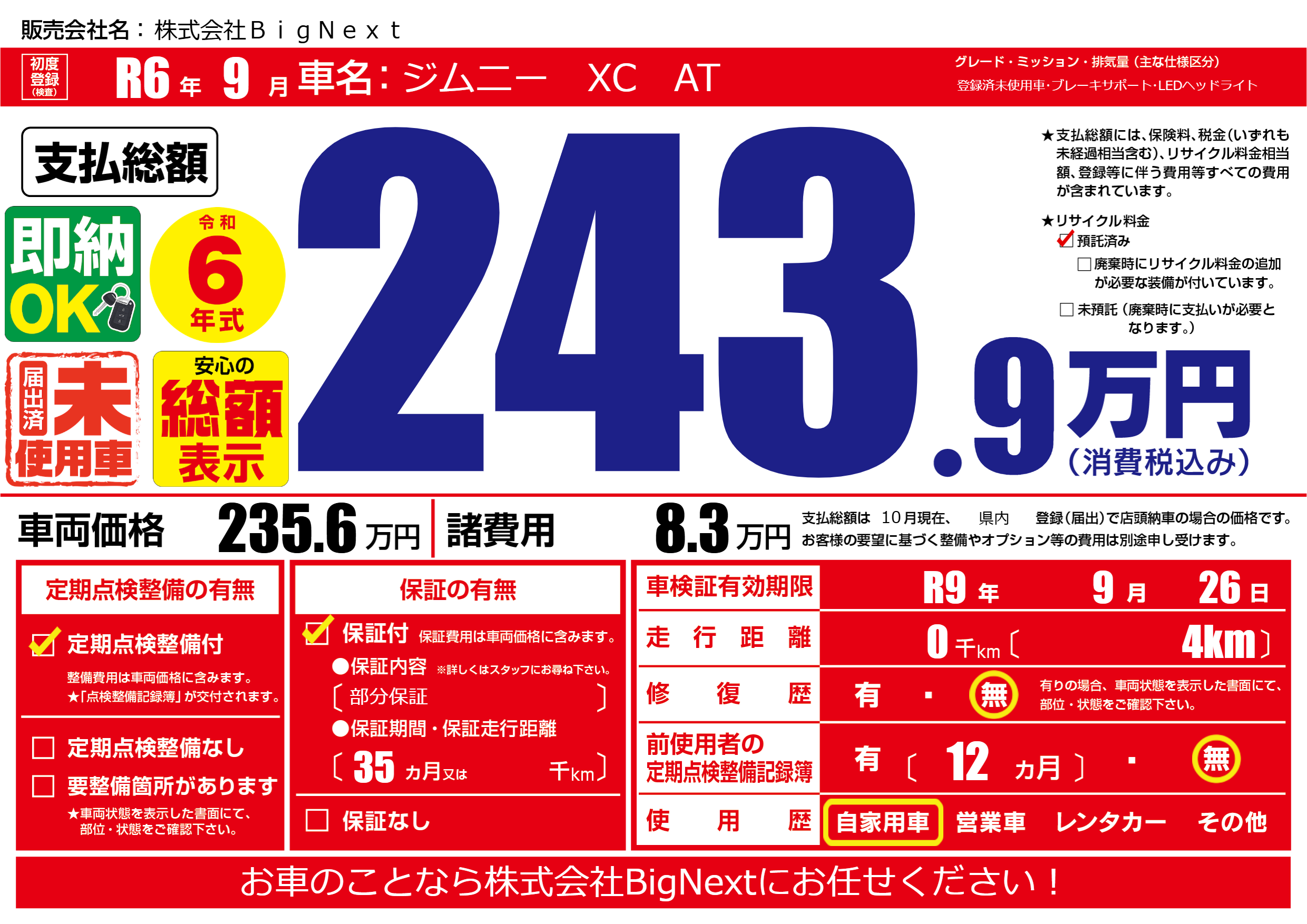 なし | 車検制限 | R9年9月26月 |