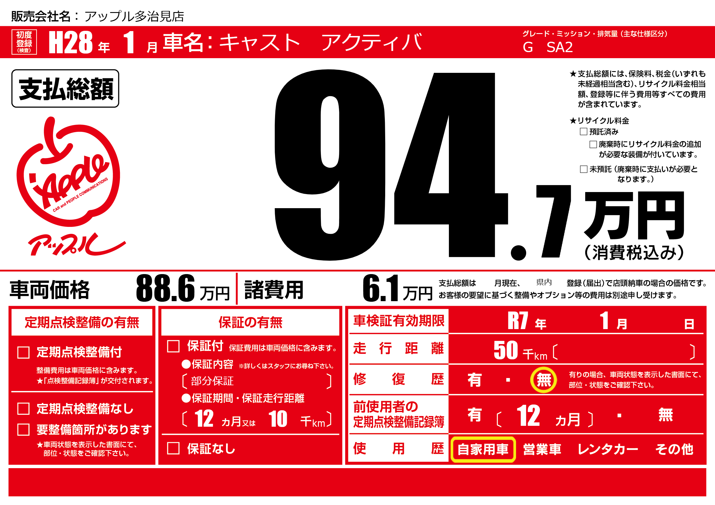 | 車名 | キャスト アクティバ | グレード ミッション 排気量 |