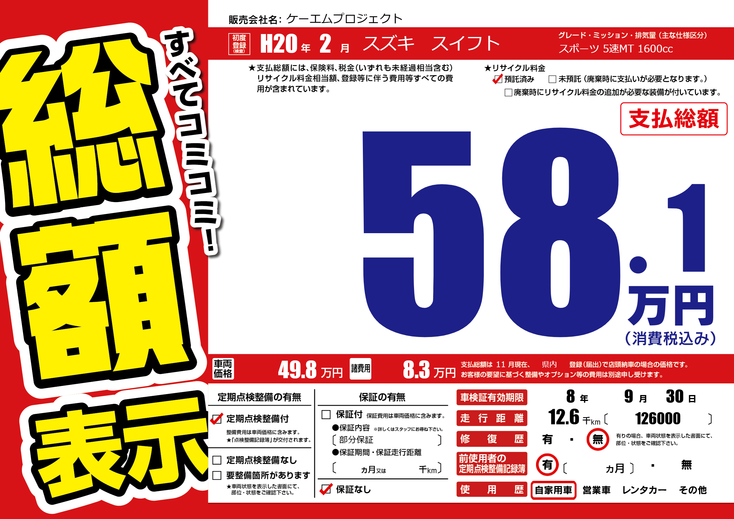 | 走行キロ | 1.2万km | 初年度登録 | H20年2月 |