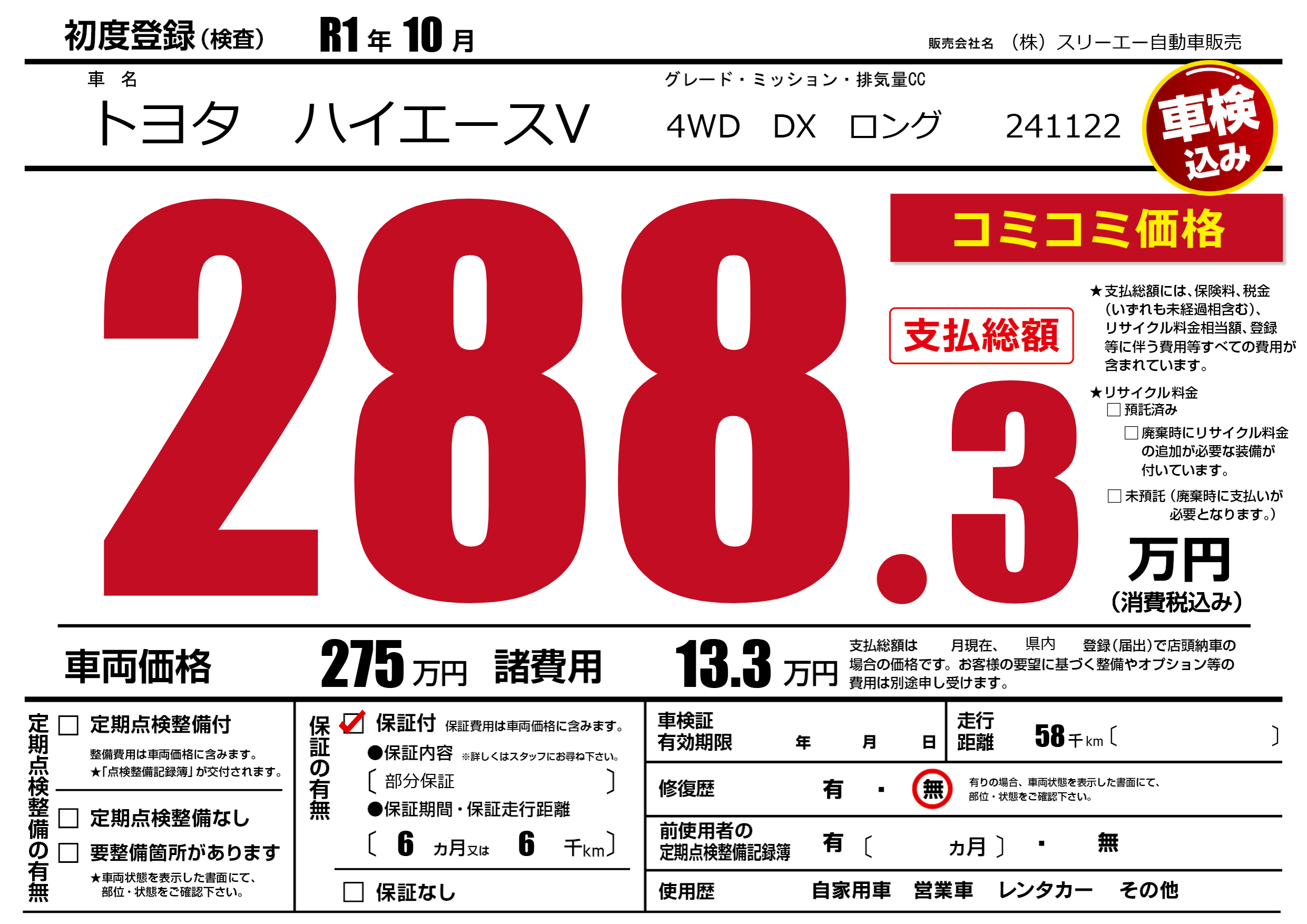 保証付き 保証内容(部分保証) 6ヶ月または(6)千kmまで |