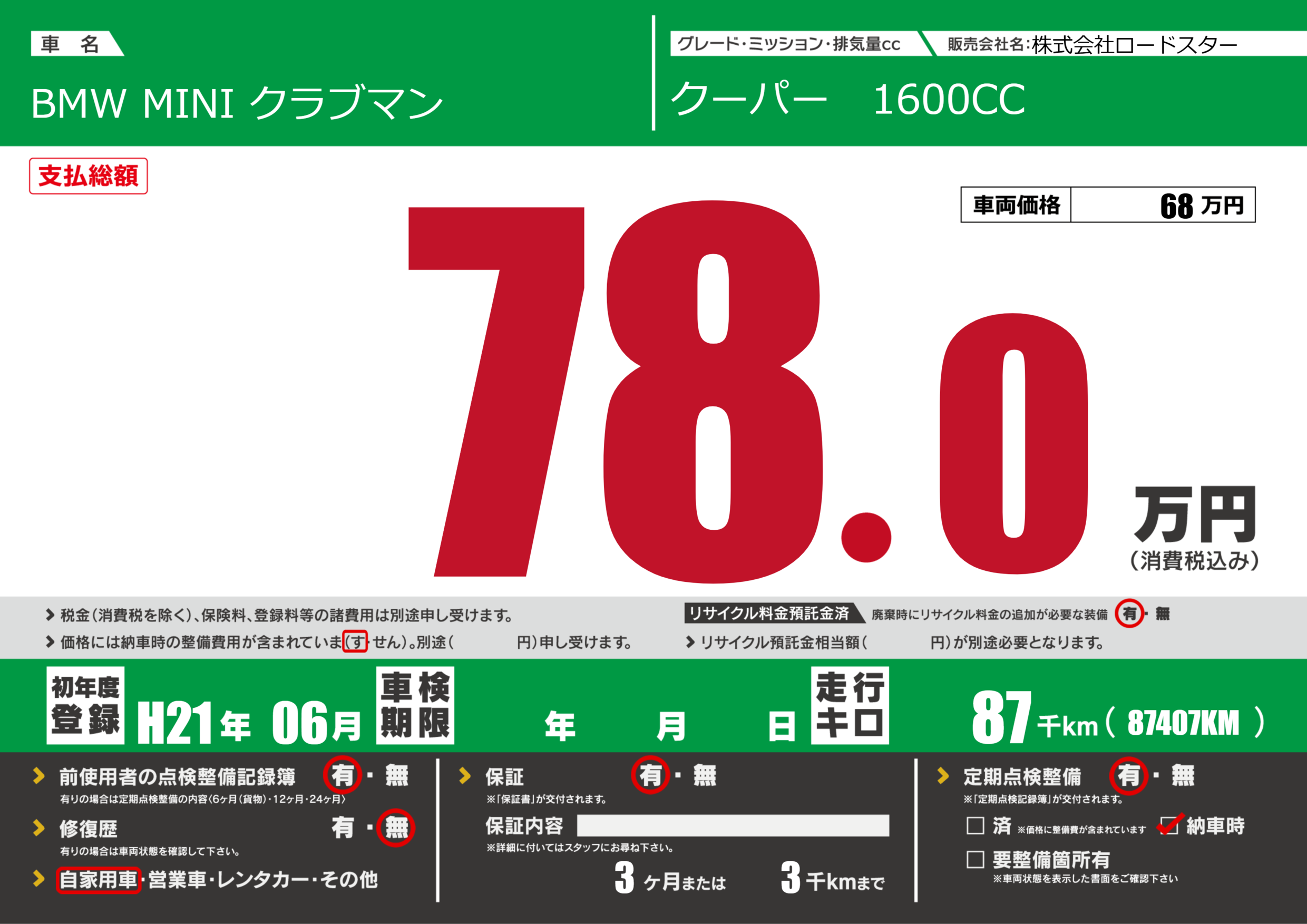 | 車名 | BMW MINI クラブマン | グレード ミッション 排気量 |