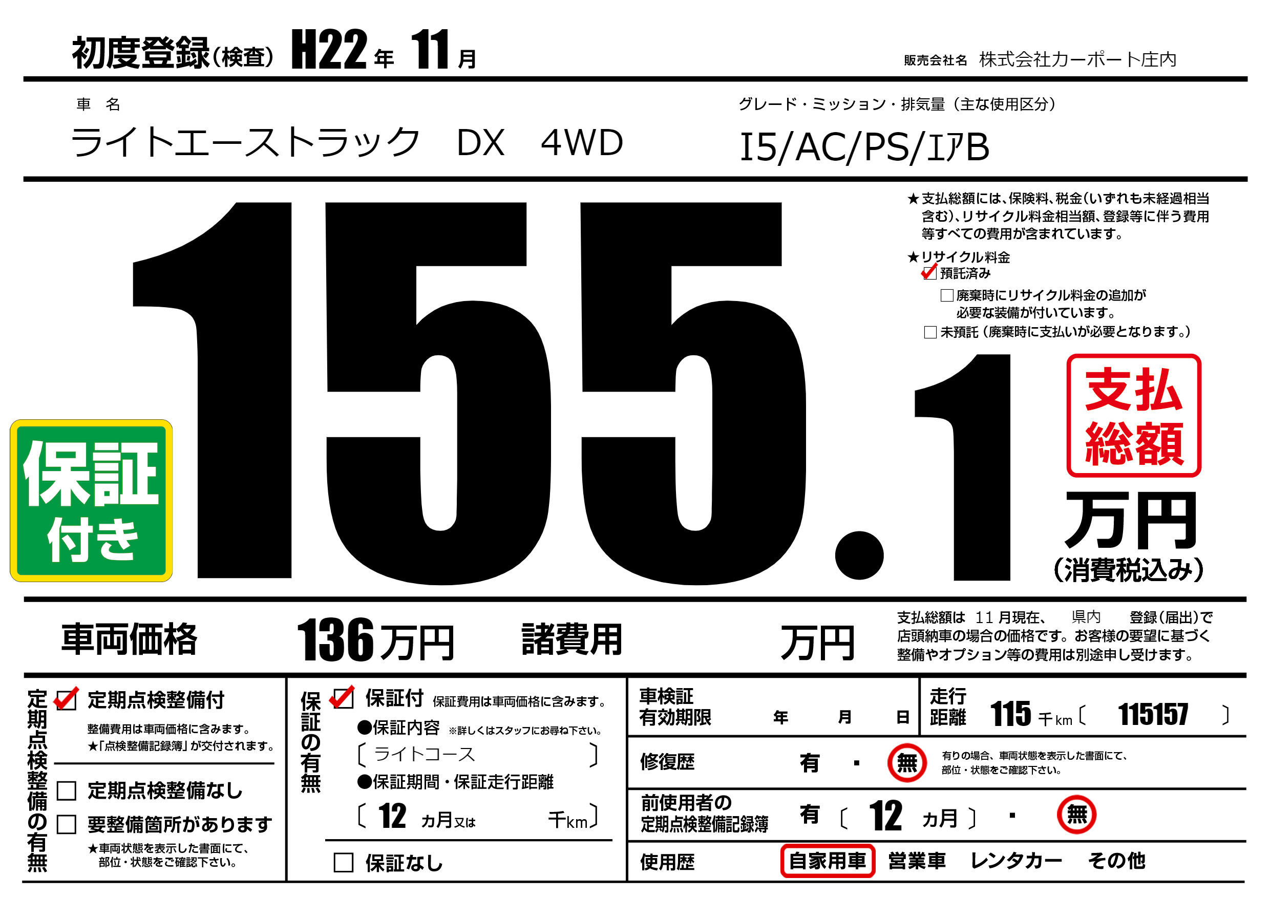 | 車名 | ライトエーストラック DX 4WD | グレード ミッション 排気量 |