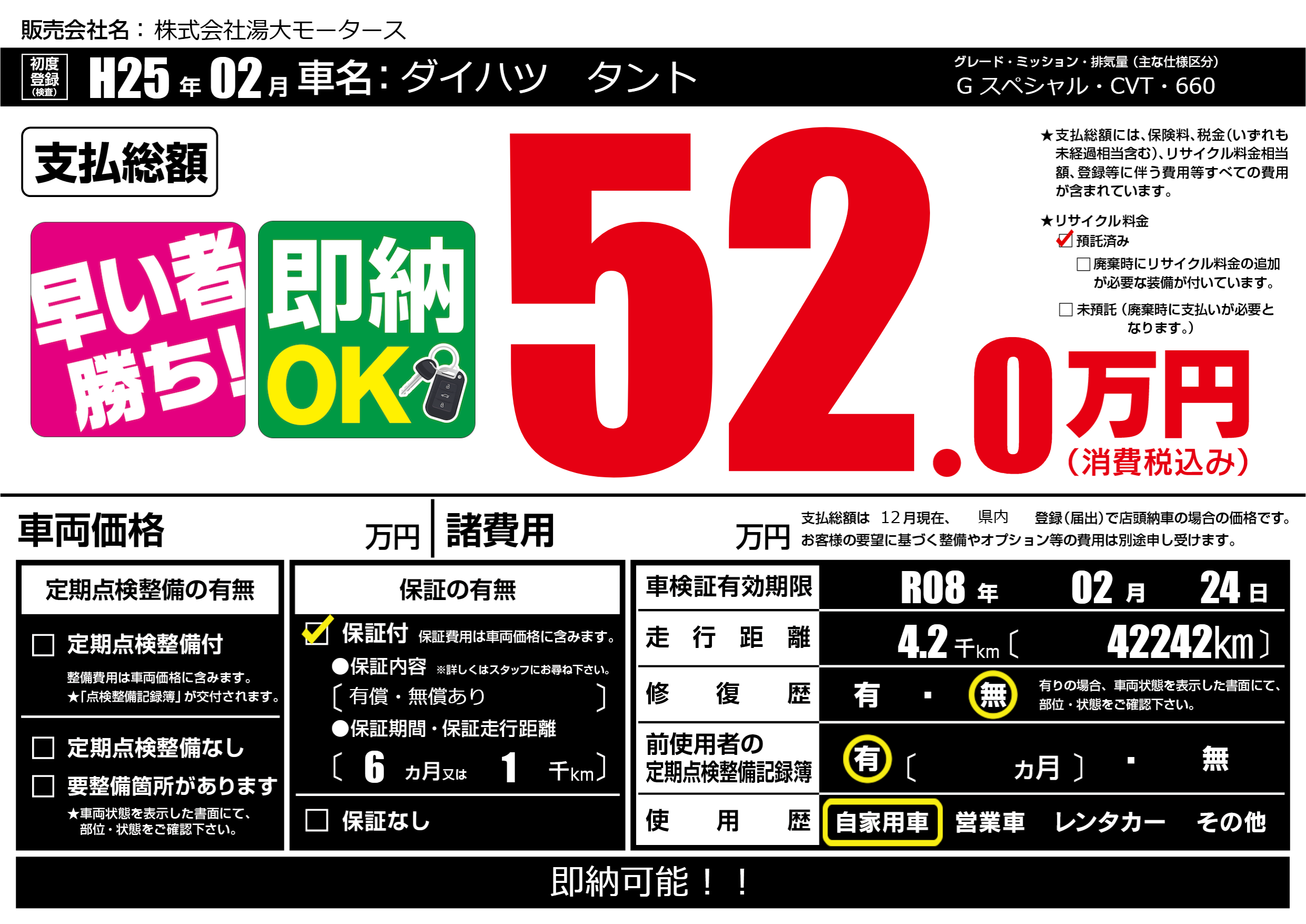 | 車名 | ダイハツ タント | グレード ミッション 排気量 |