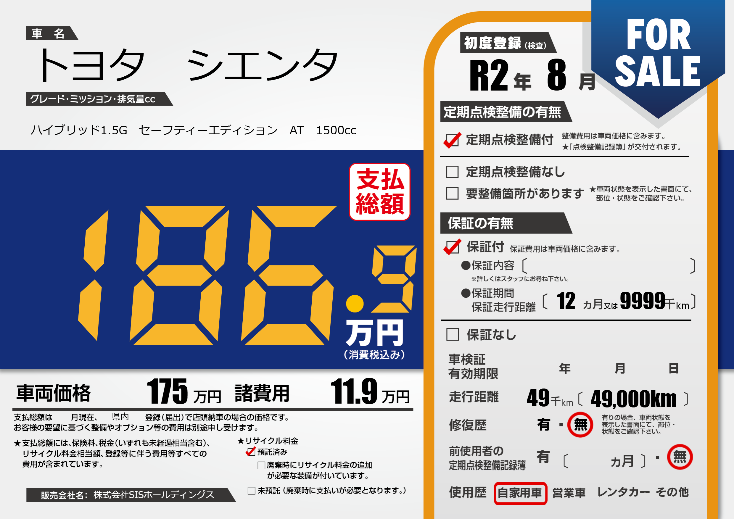| 車名 | トヨタ シエンタ | グレード ミッション 排気量 |