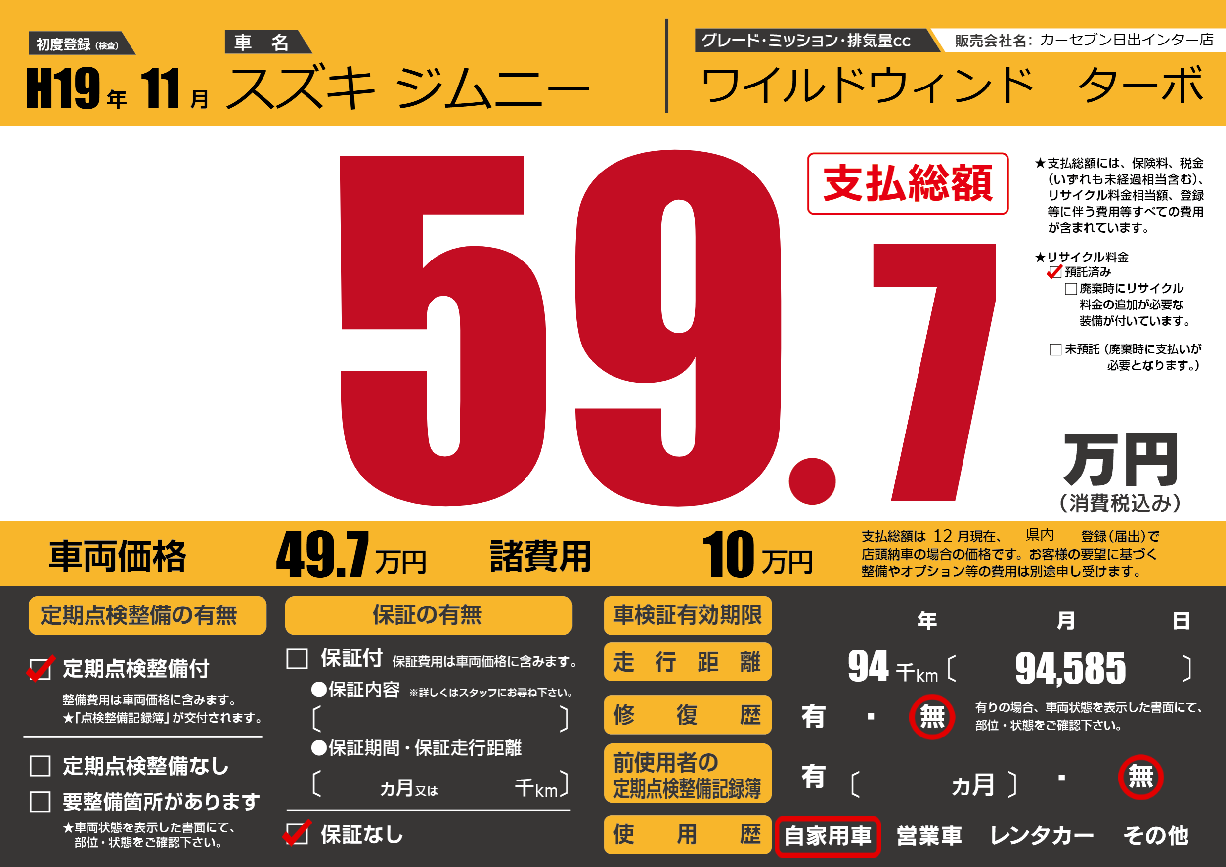 | 走行キロ | 9.4万km | 初年度登録 | H19年11月 |