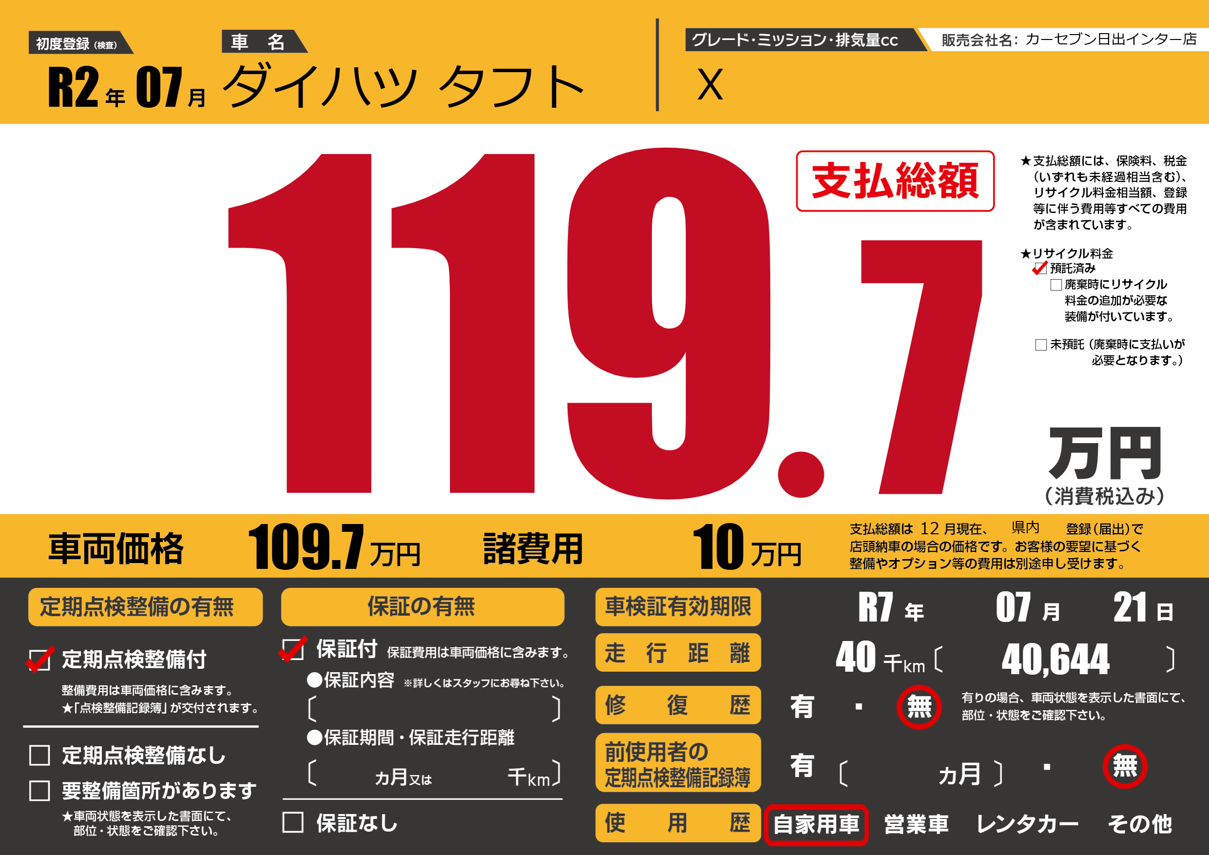 | 車名 | ダイハツ タフト | グレード ミッション 排気量 |