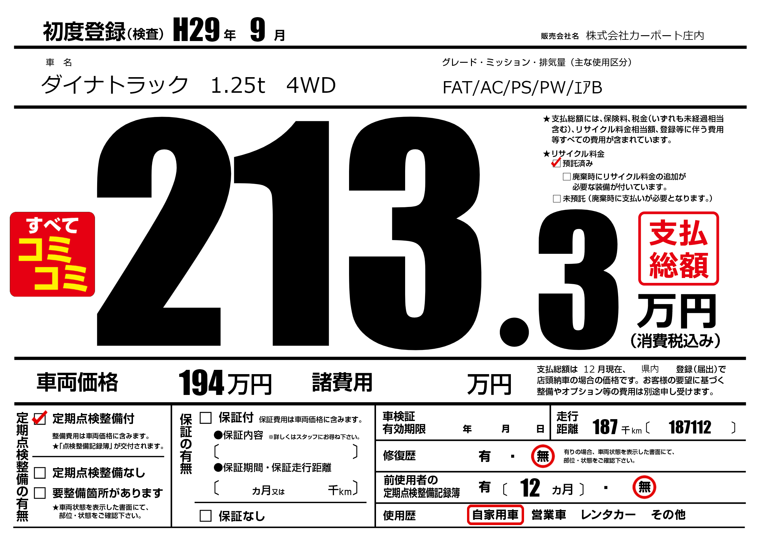 | 車名 | ダイナトラック 1.25t 4WD | グレード ミッション 排気量 |