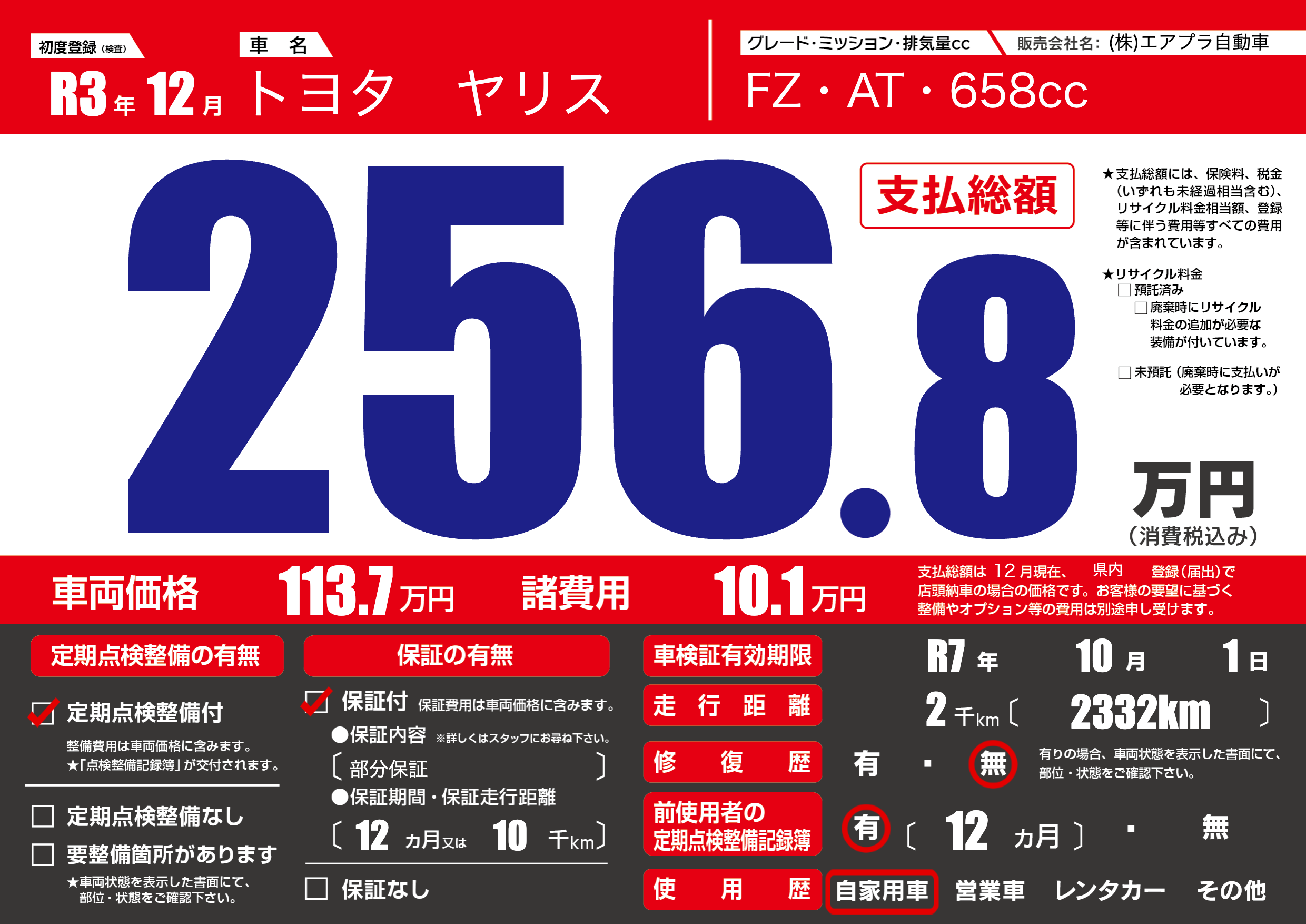 | 走行キロ | 0.2万km | 初年度登録 | R3年12月 |
