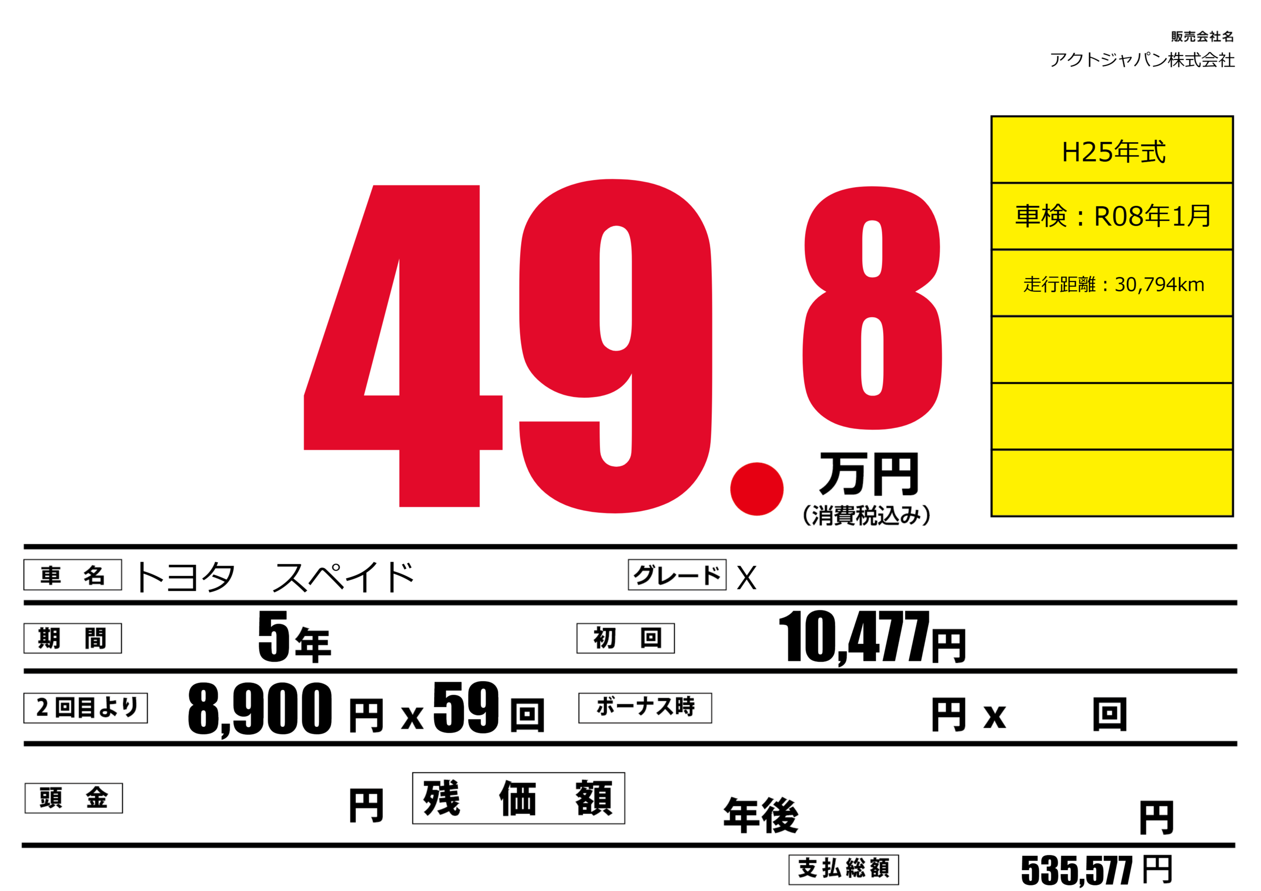 | 車名 | トヨタ スペイド | グレード ミッション 排気量 |