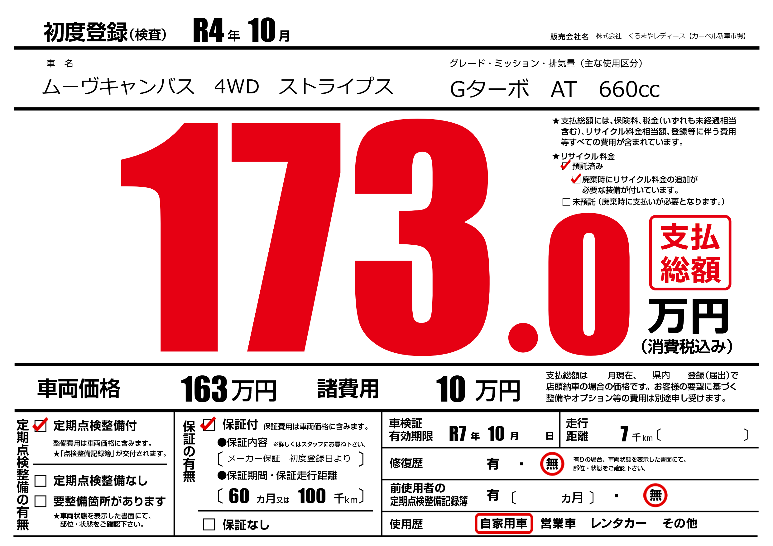 | 走行キロ | 0.7万km | 初年度登録 | R4年10月 |