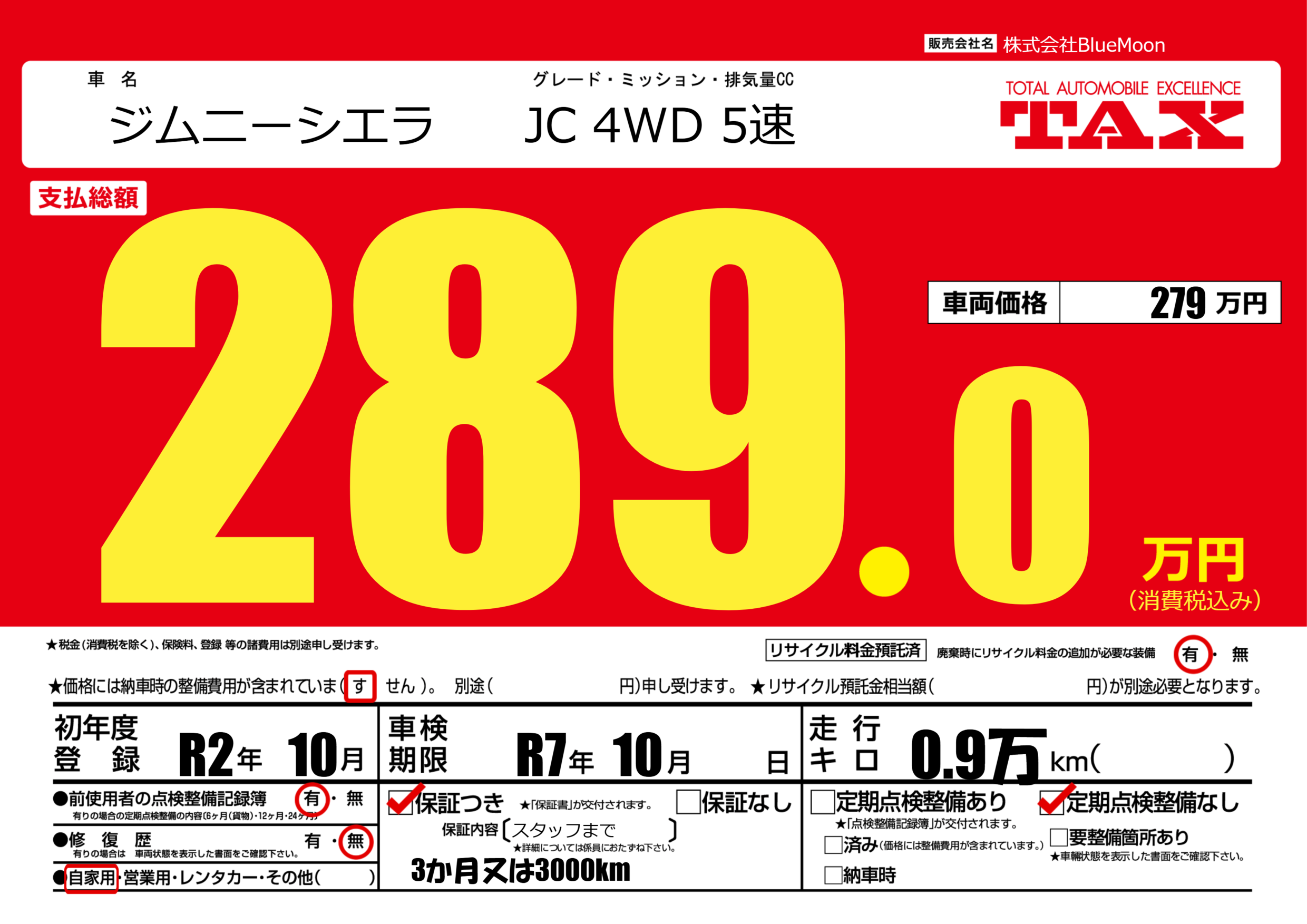 | 車名 | ジムニーシエラ | グレード ミッション 排気量 |