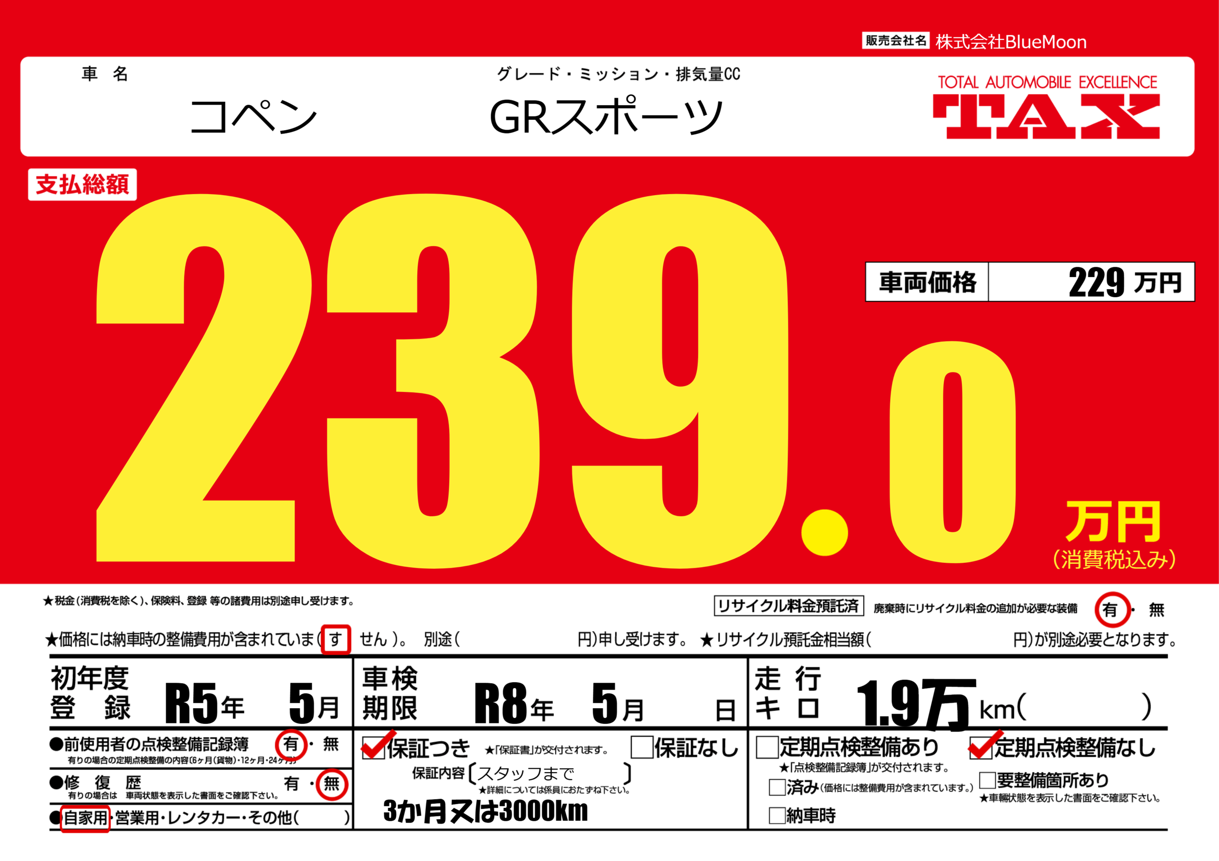 | 走行キロ | 0.1万km | 初年度登録 | R5年5月 |