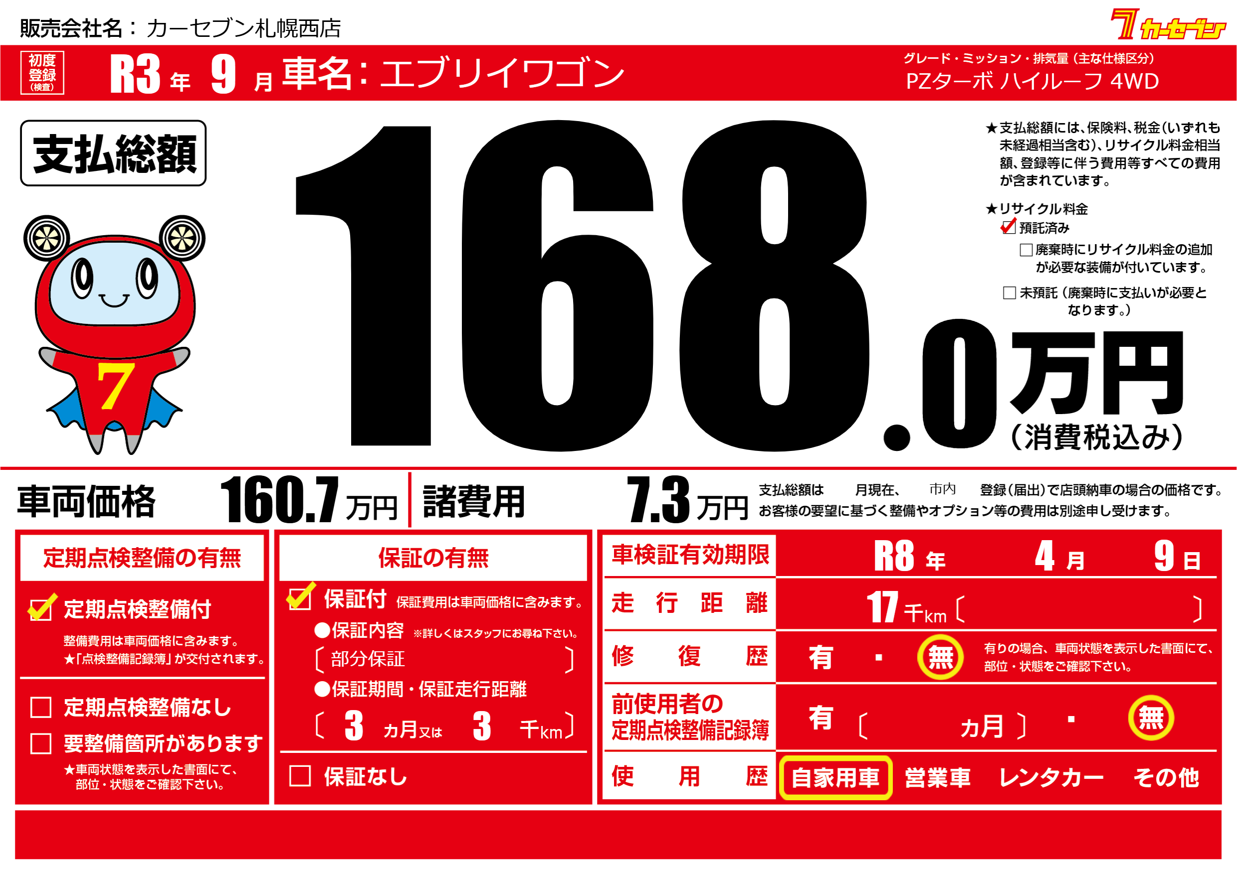 | 車名 | エブリイワゴン | グレード ミッション 排気量 |