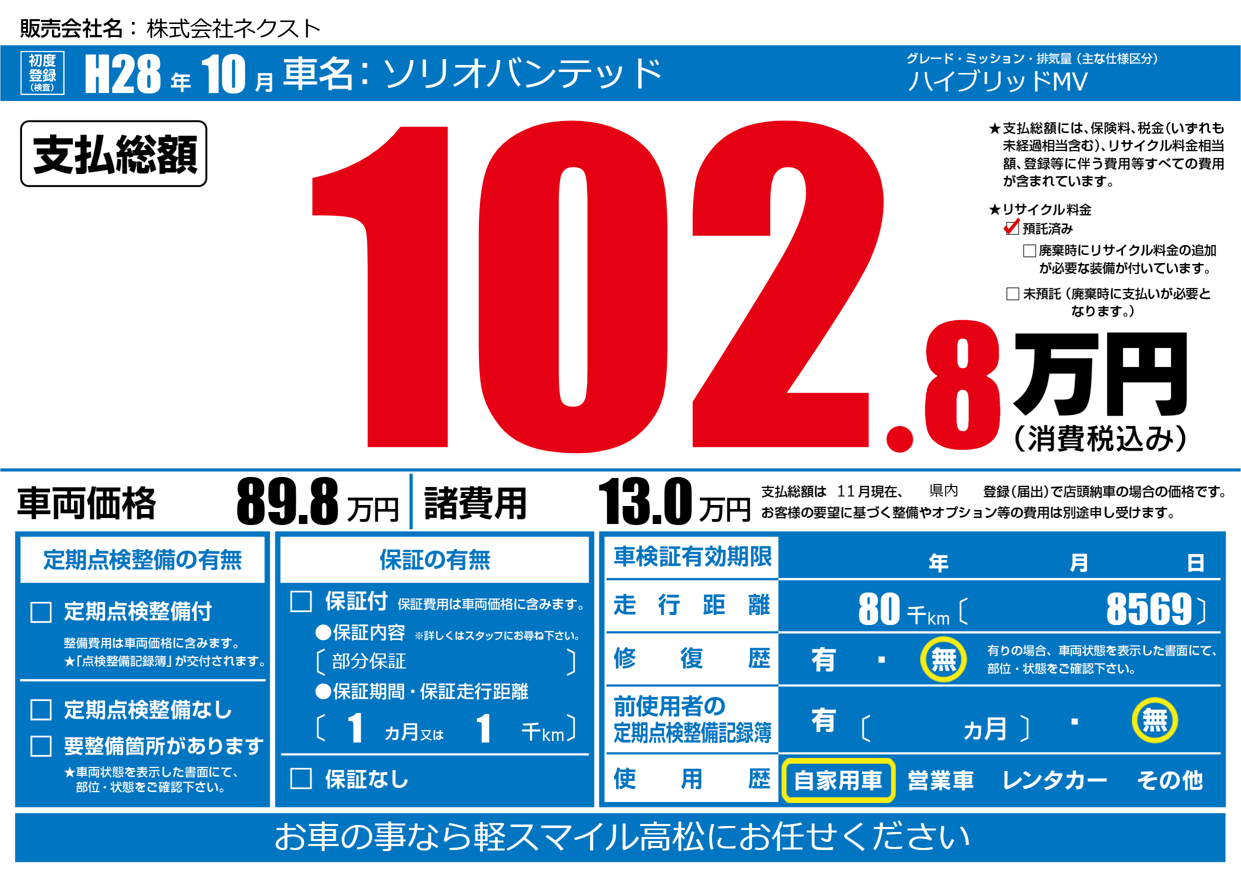 | 走行キロ | 8万km | 初年度登録 | H28年10月 |