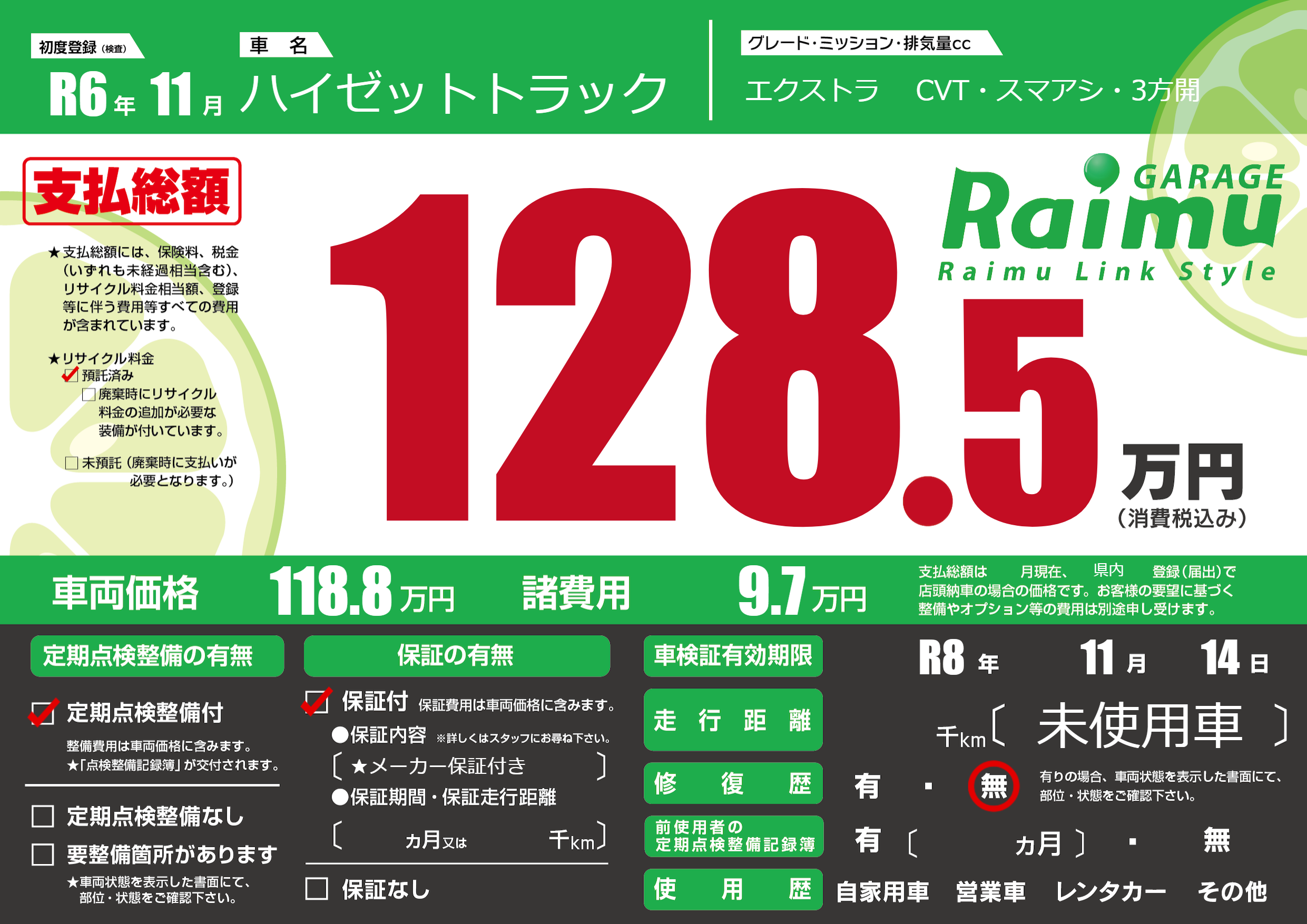 | 車名 | ハイゼットトラック | グレード ミッション 排気量 |