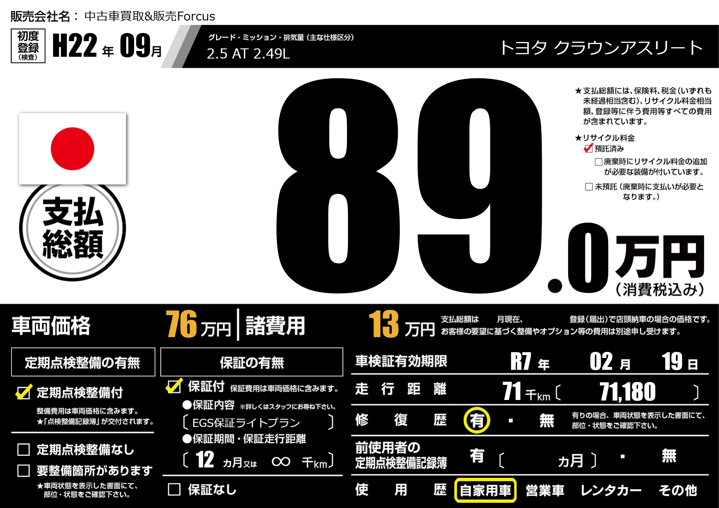 | 車名 | トヨタ クラウンアスリート | グレード ミッション 排気量 |