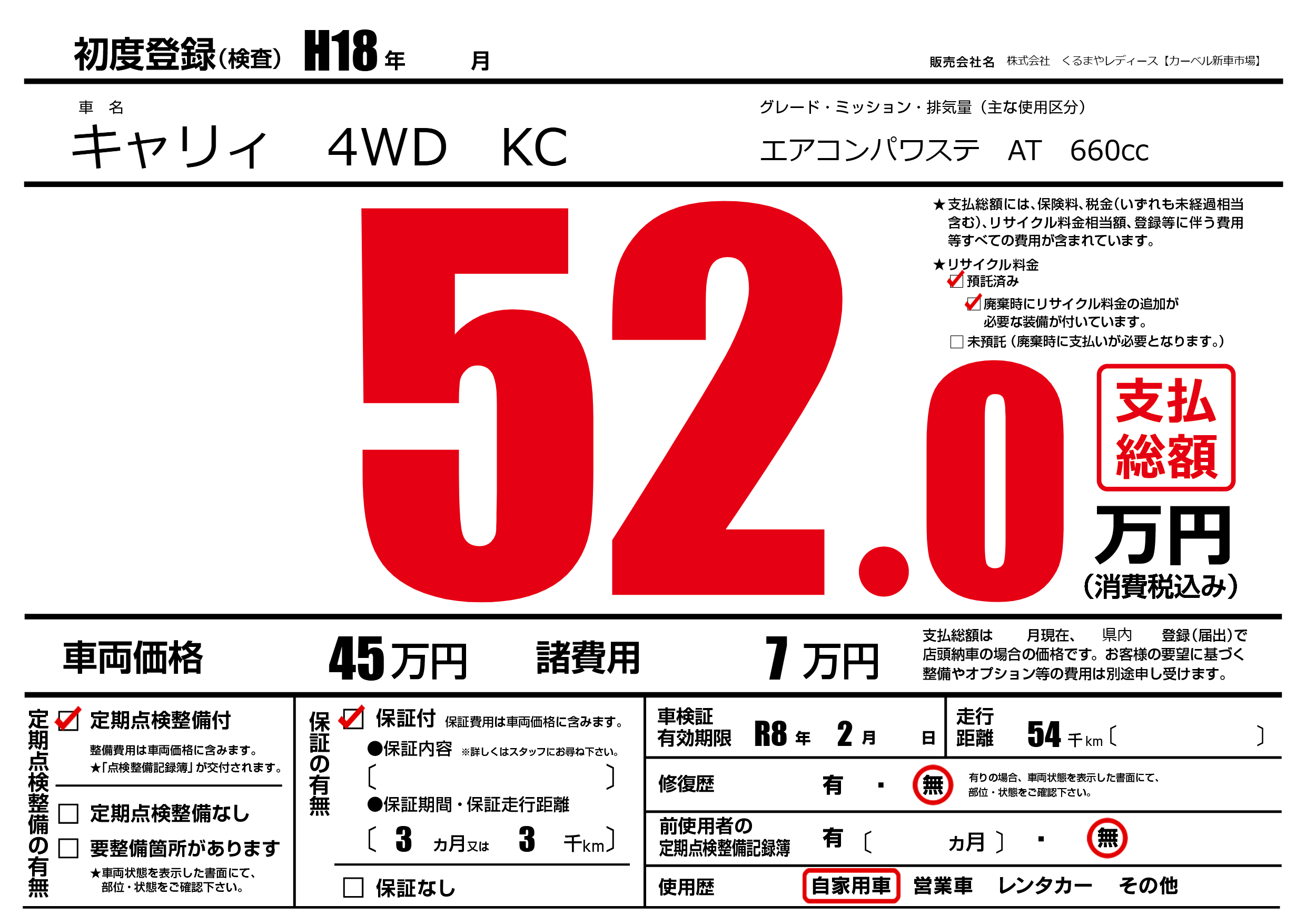 | 車名 | キャリィ 4WD KC | グレード ミッション 排気量 |