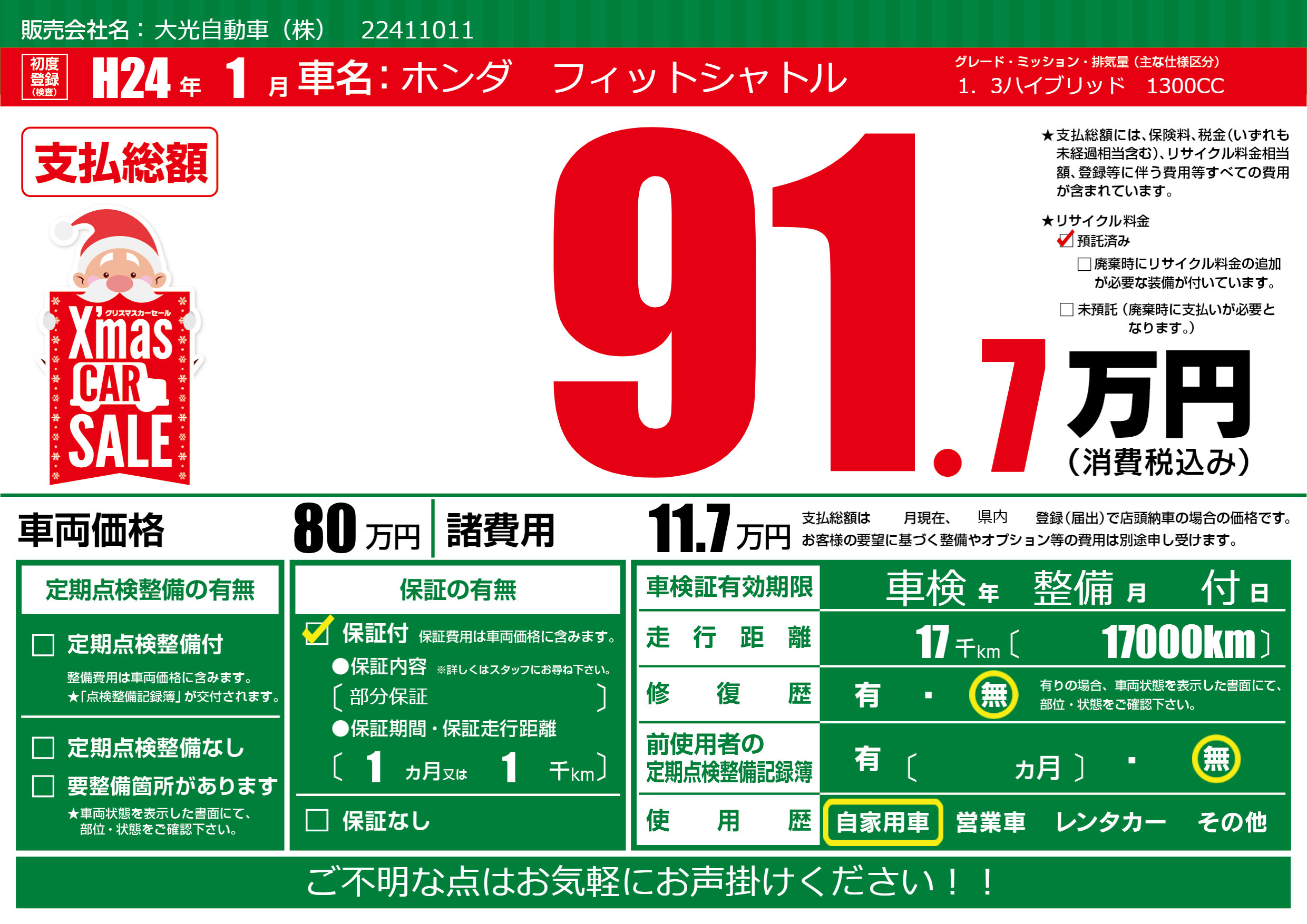 | 走行キロ | 1.7万km | 初年度登録 | H24年1月 |
