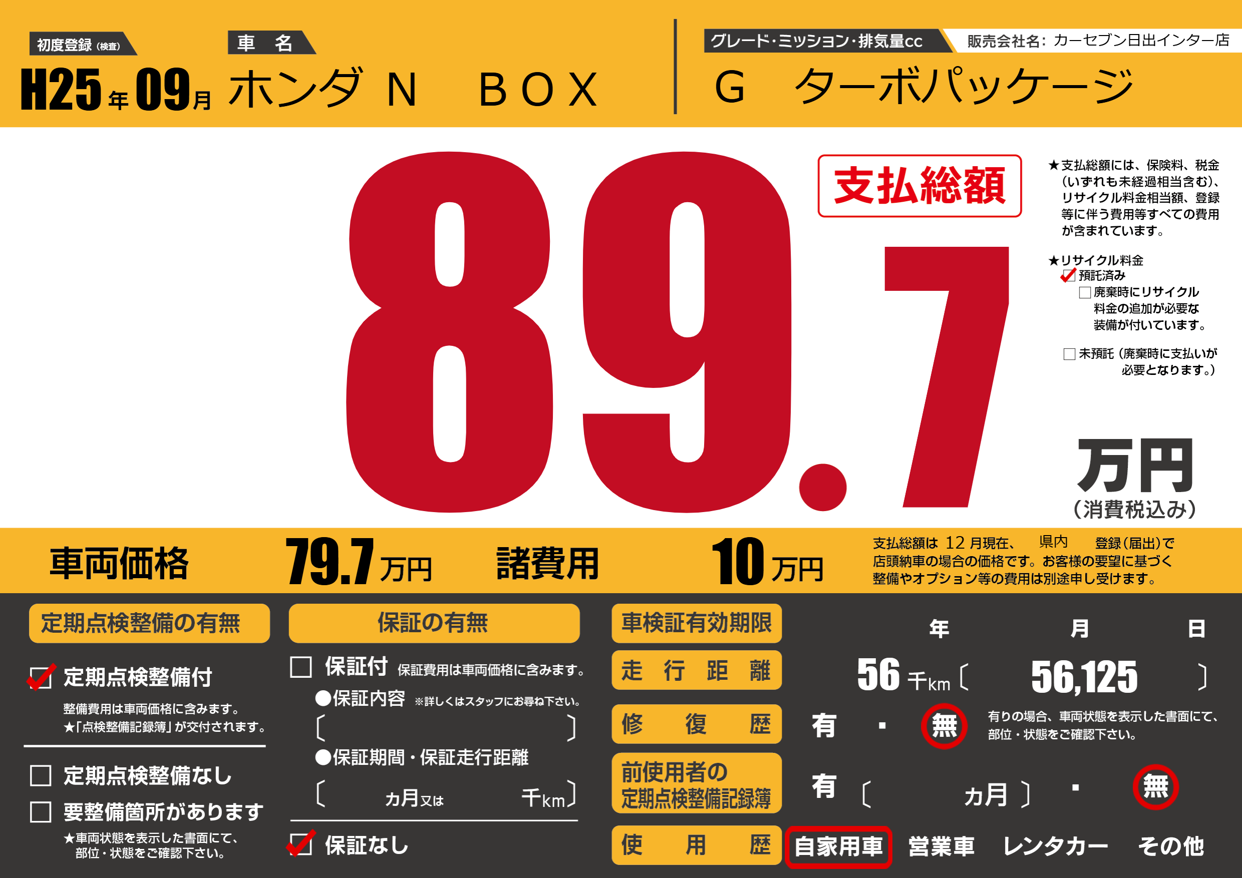 | 走行キロ | 5.6万km | 初年度登録 | H25年09月 |