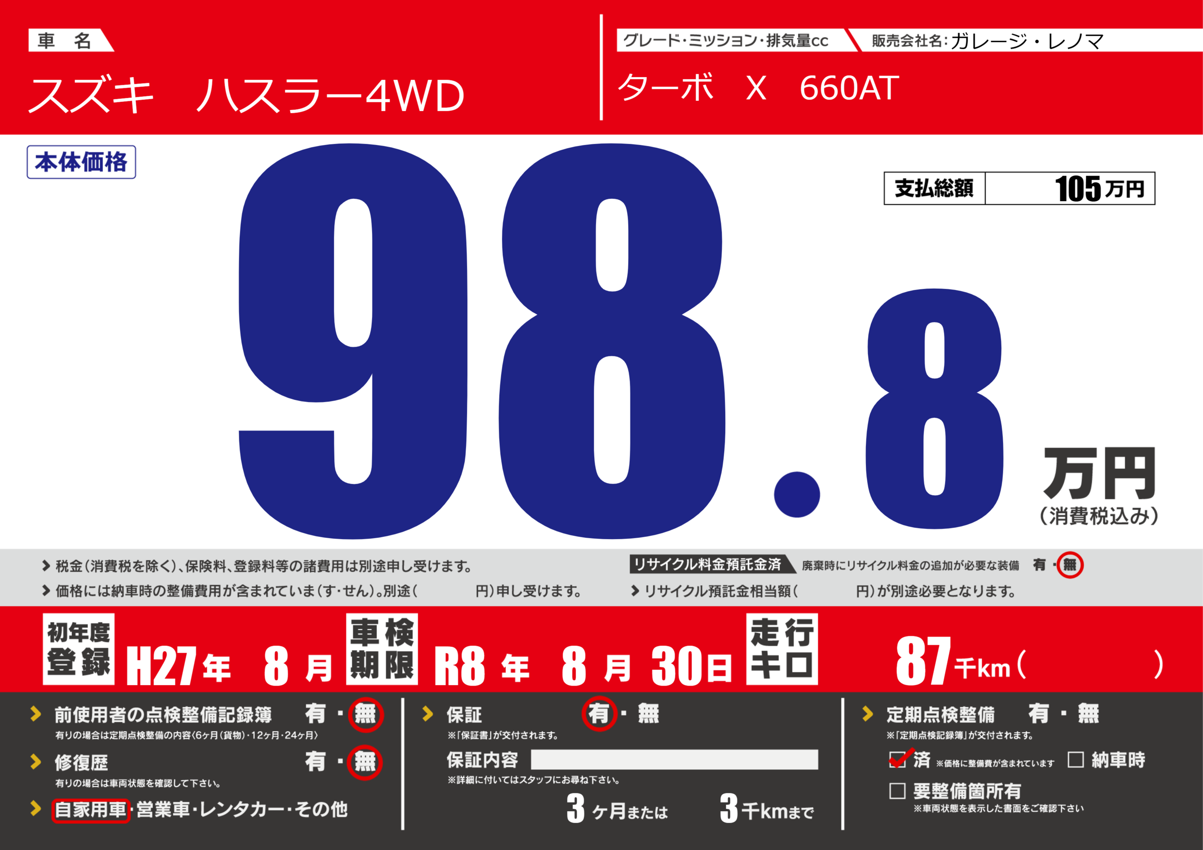 | 車名 | スズキ ハスラー4WD | グレード ミッション 排気量 |