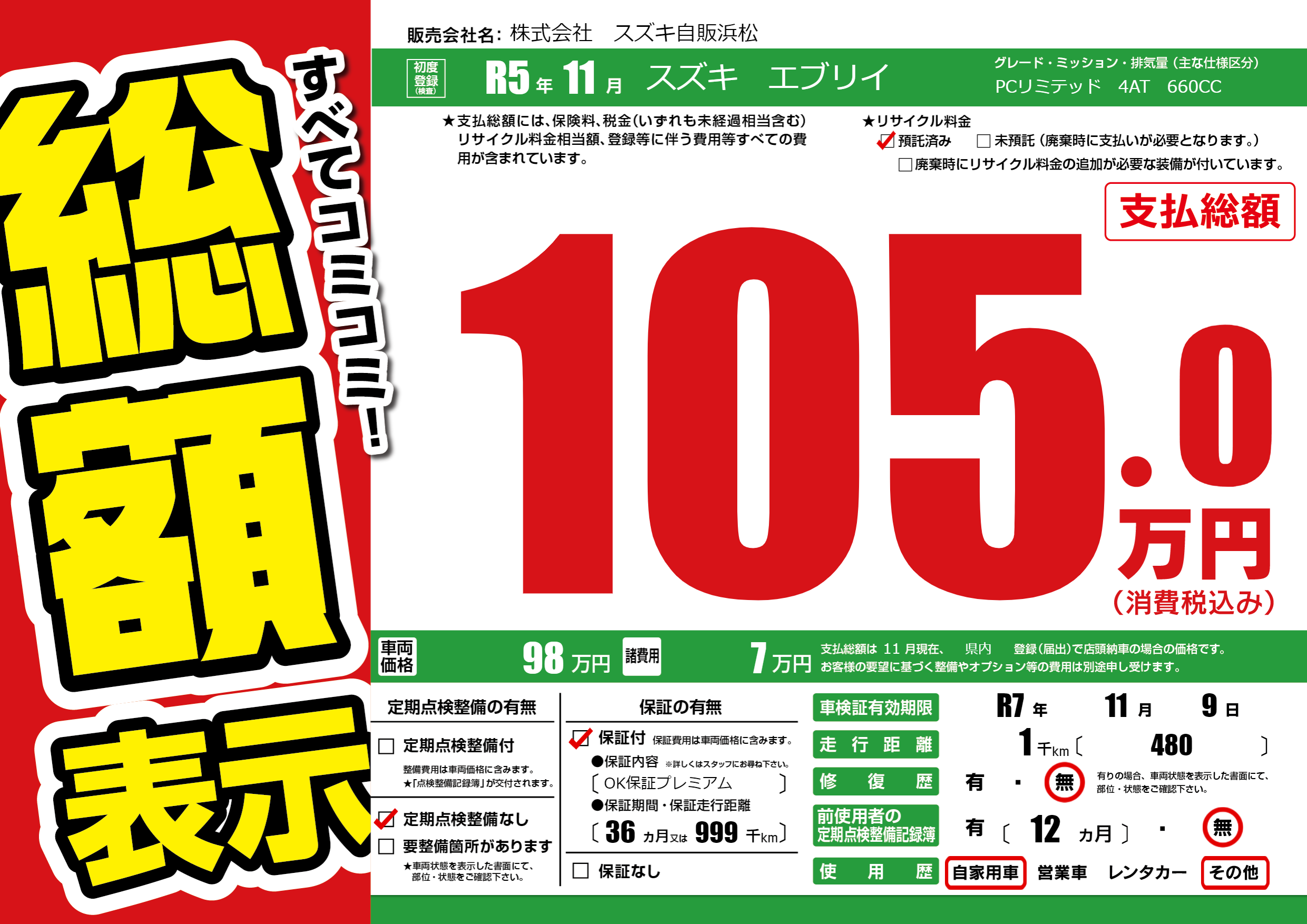 | 走行キロ | 0.1万km | 初年度登録 | R5年11月 |